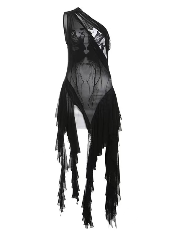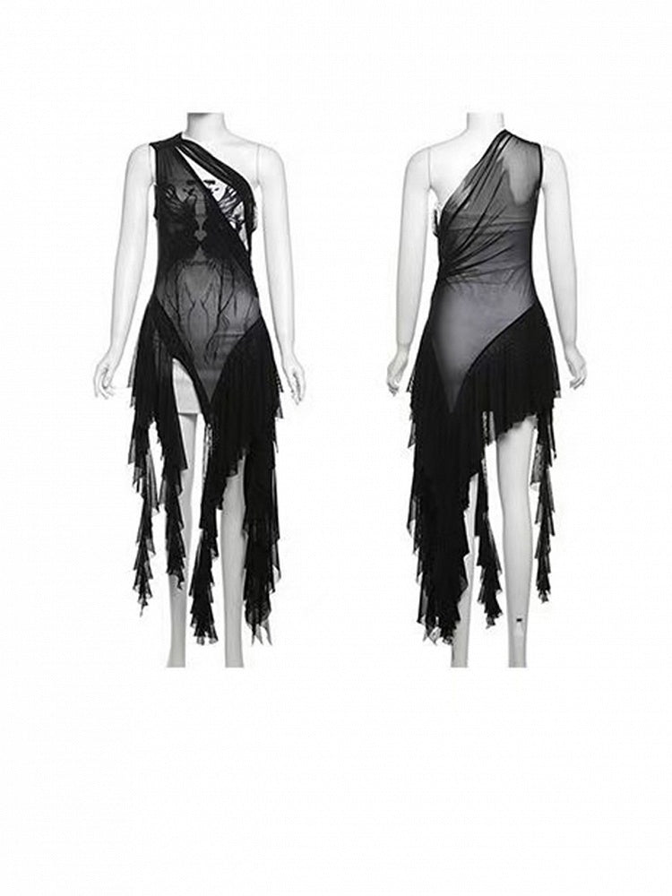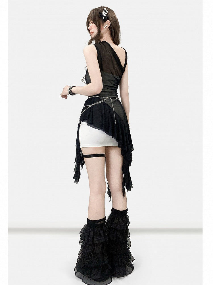 ブラックのほろ苦いカスケーディングフリルアクセント、セミシースルーアシンメトリーネックライントップ