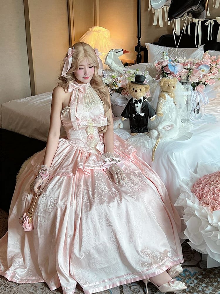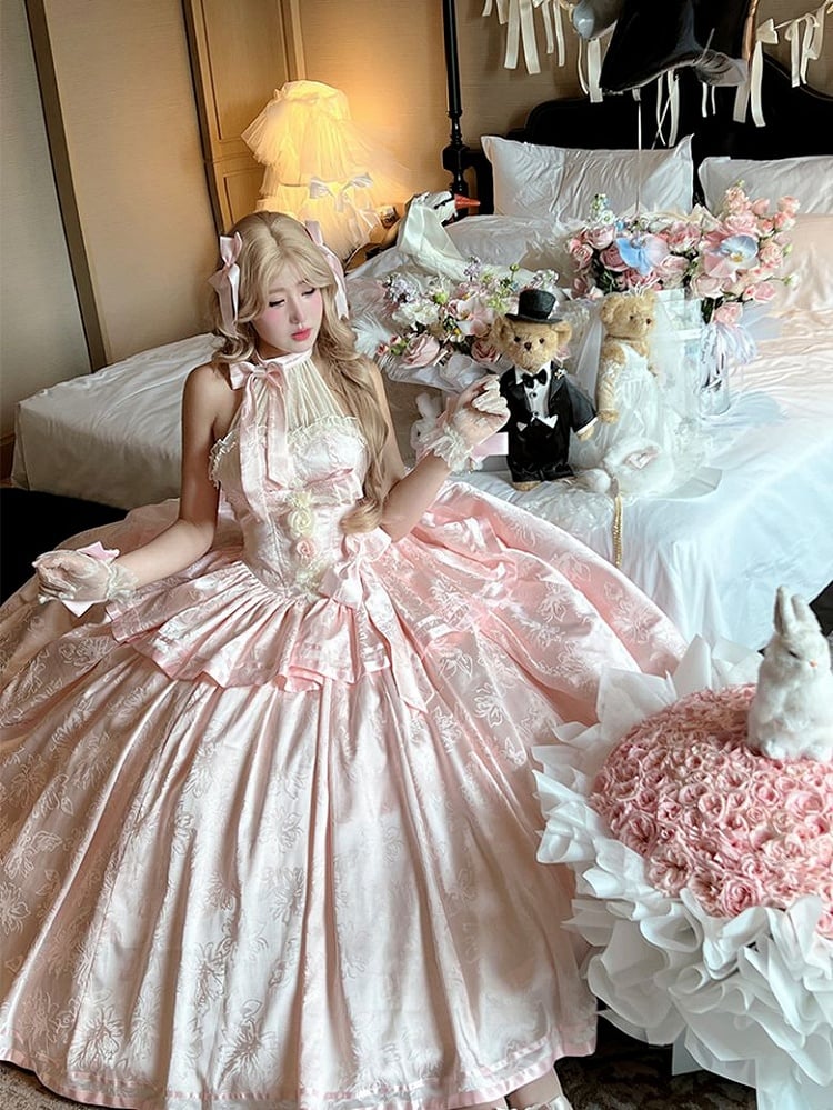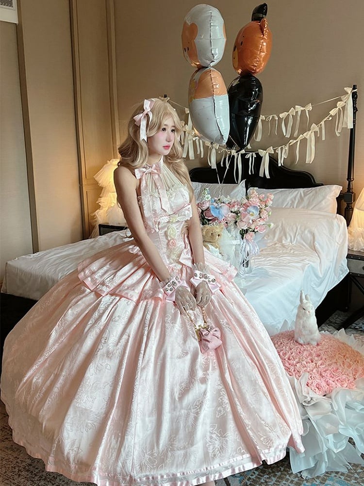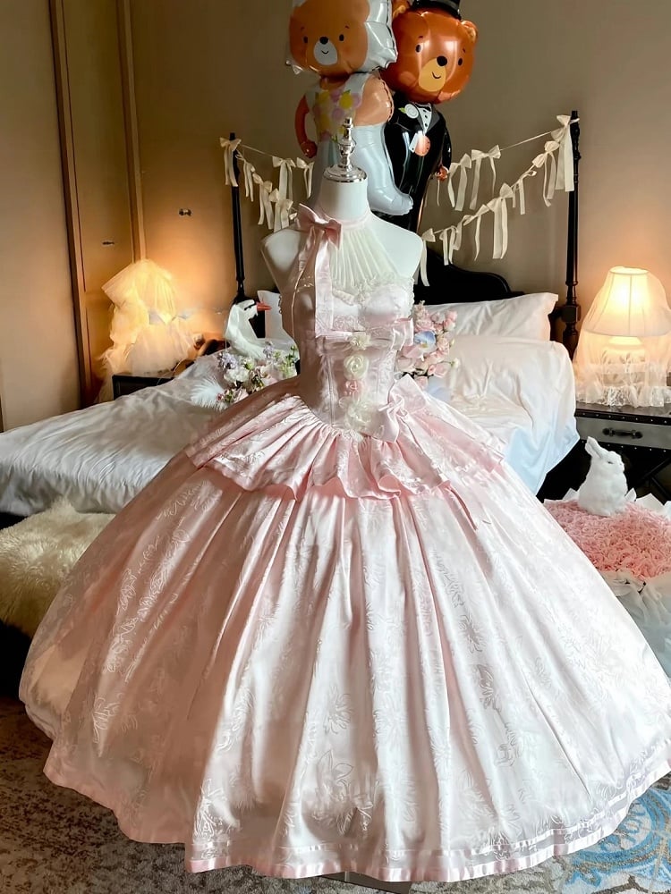 Pink Satin Ball Gown with Halter Neck Tie and Floral Accents