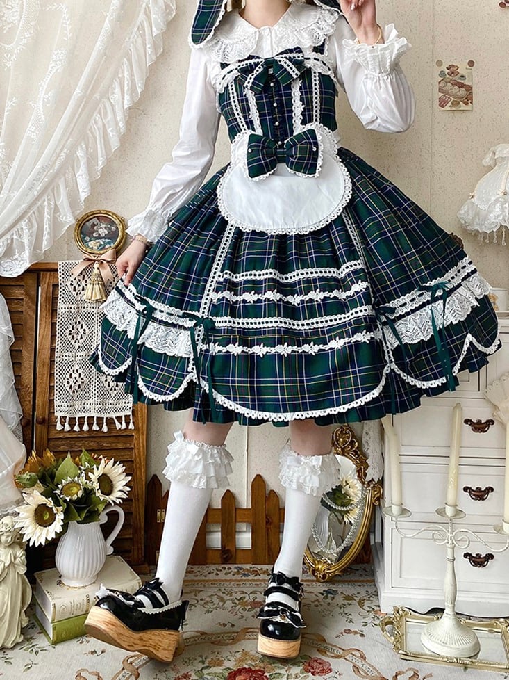 Green Plaid Scalloped Edge Trim Sweet Lolita Jumper Skirt with Bow Accents