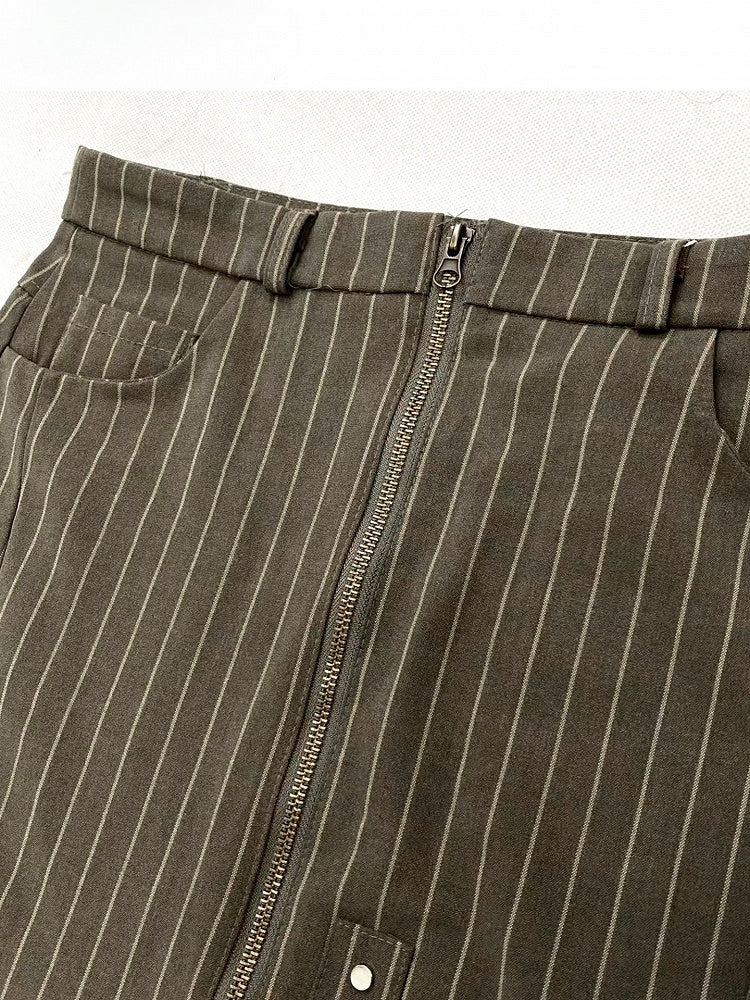 アーミーグリーンミラードファッションストライプ柄コントラストレースパッチカスケーディングフリルアクセントスカート