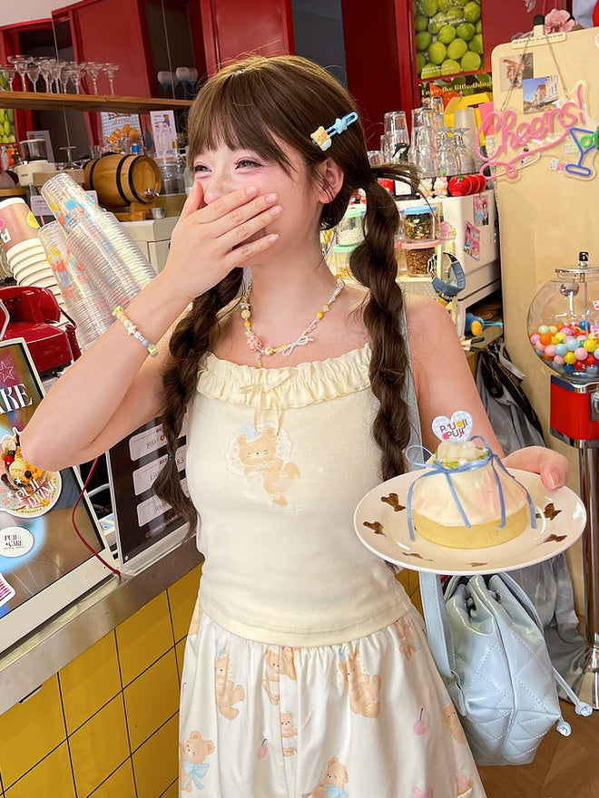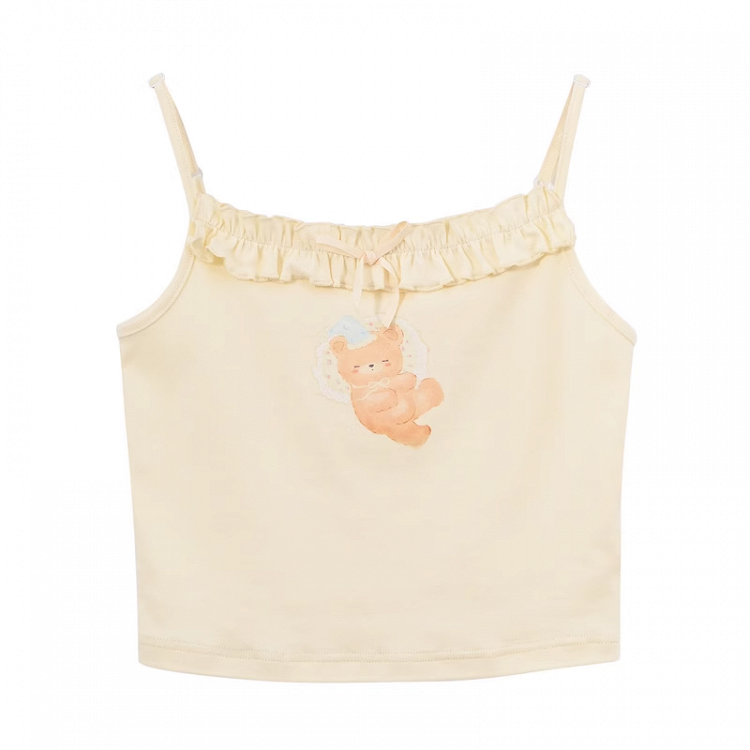愛らしいクマ柄キャミソールトップス ネックライン ライトイエロー フリル