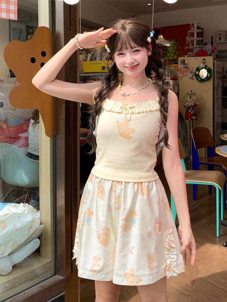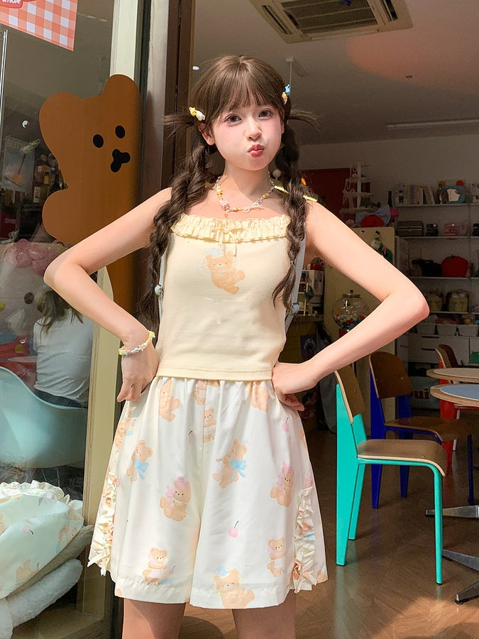 ライトイエローのフリルネックラインの愛らしいクマ柄キャミソールトップス