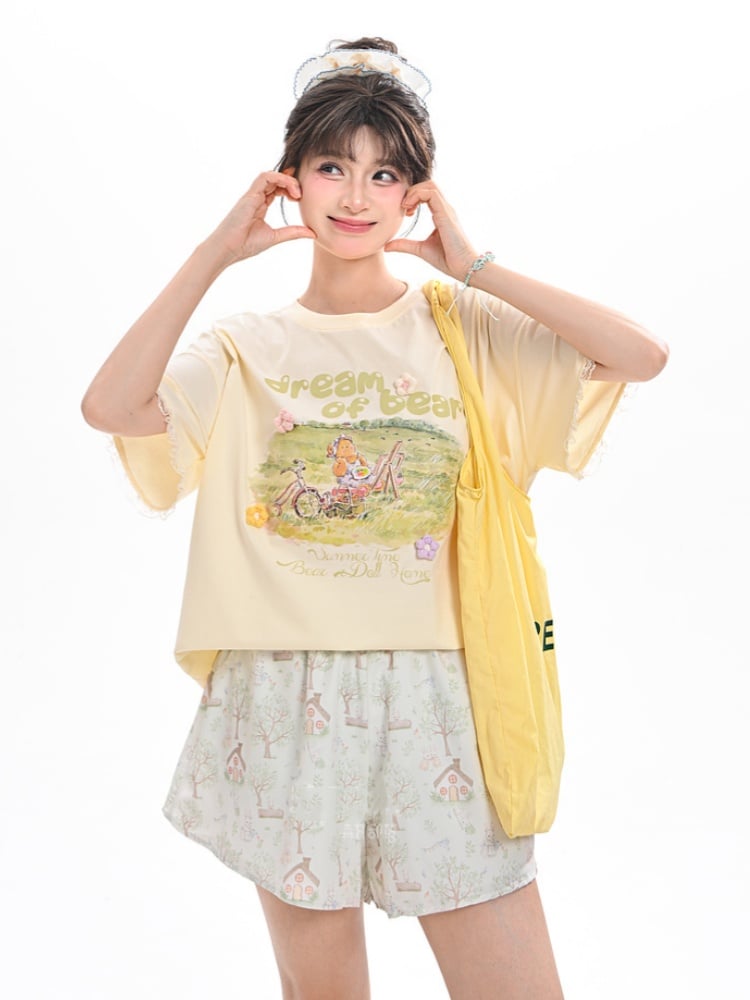 愛らしいウサギ柄のグリーンのドローストリングウエストワイドレッグショーツ