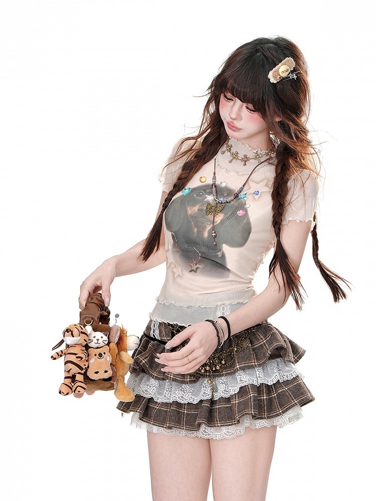 愛らしい子犬のカーキ/ピンクのフリルトリムのほろ苦いメッシュTシャツ