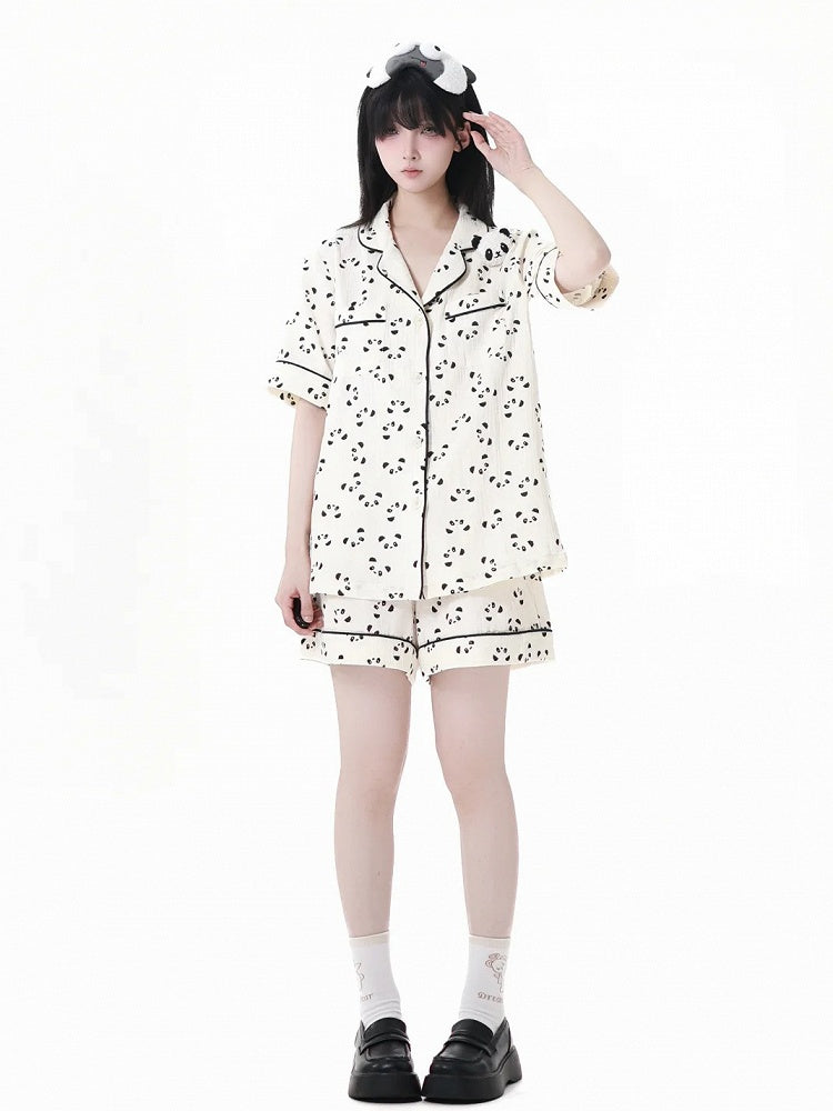 ベージュのスカラップエッジカラーと総柄パンダプリントシャツ+伸縮性ウエストショーツパジャマセット