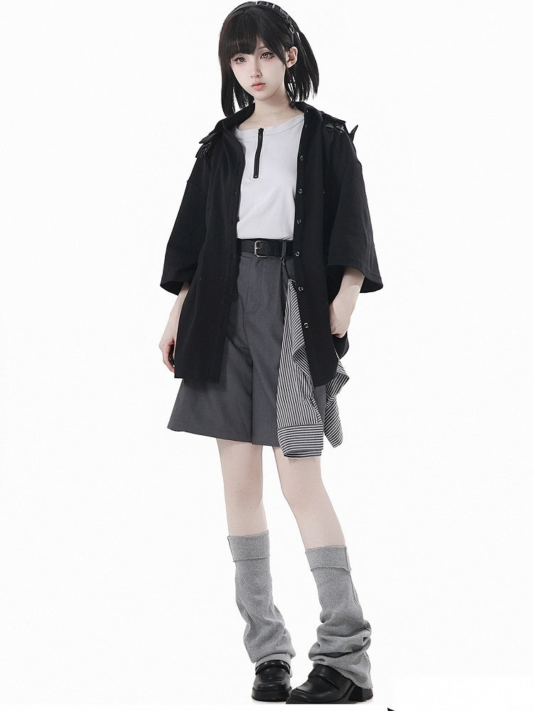 ストライプグレーのカジュアルバックルベルトショーツ