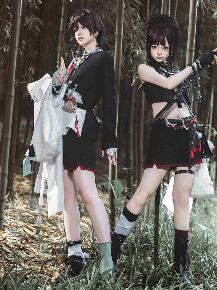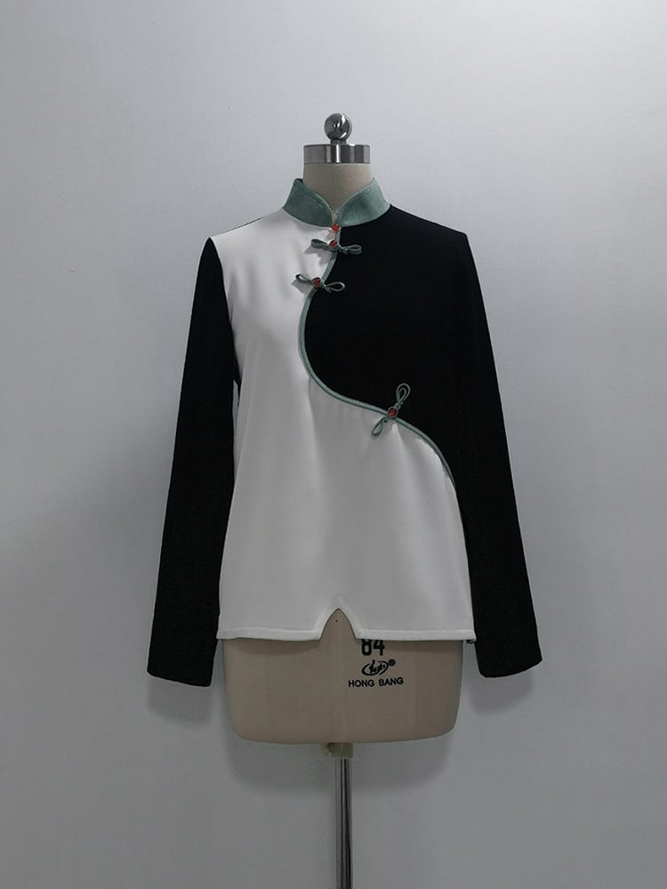 黒と白の王子ファッション長袖トップス、緑のバンドカラーとノットボタン