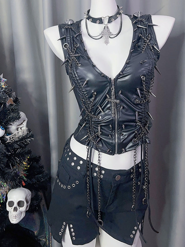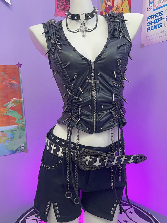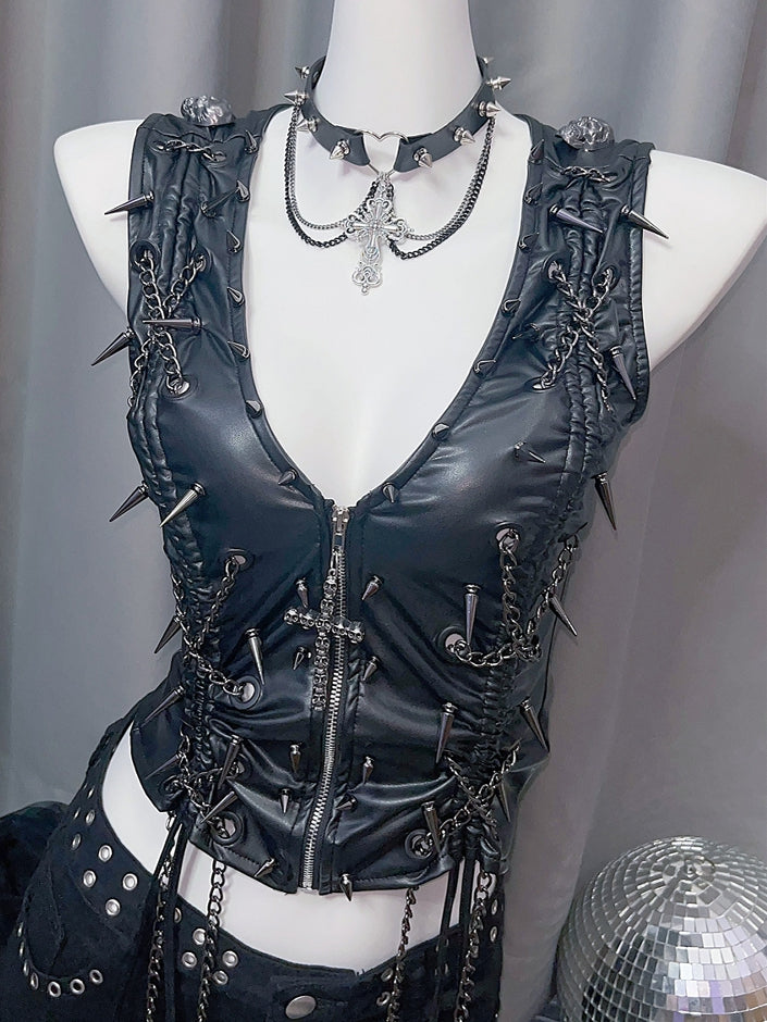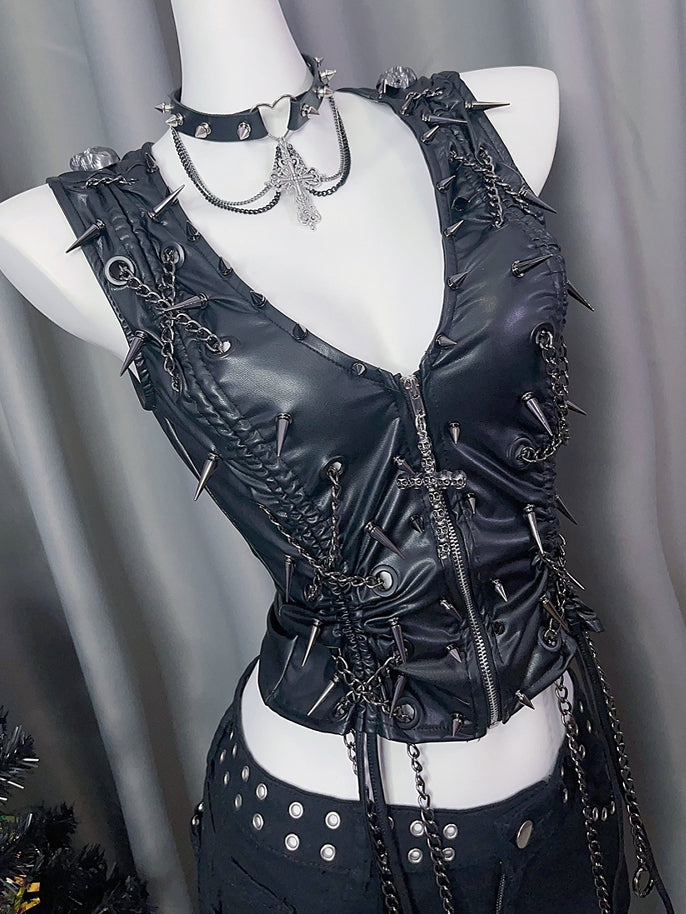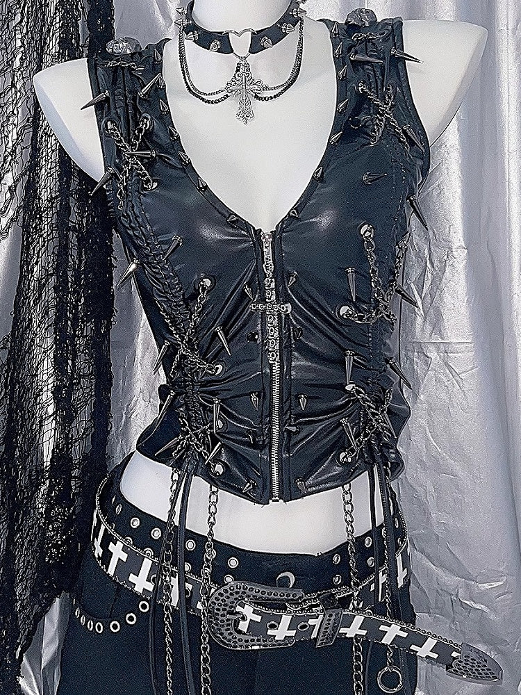 ブラック Y2K クロスチャーム ジッパー開閉 スケルトン&スタッズ装飾 PU パンク ウエストコート ノースリーブ トップ