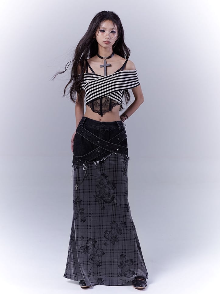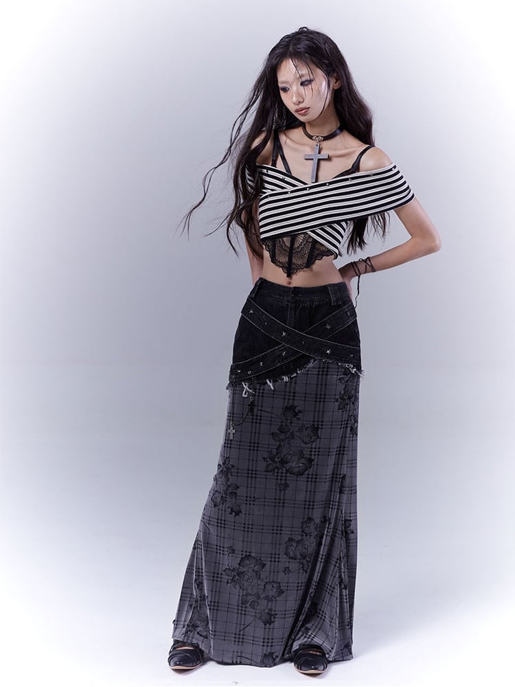 ブラック&ホワイトのオフショルダーネックラインスタッズストライプストラップレストップス