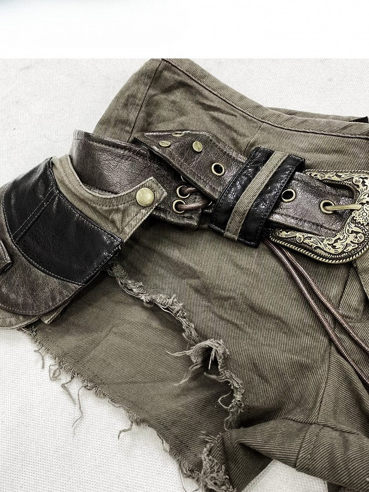 アーミーグリーンのローウエスト、カットオフ&ほつれカフス、ウエストベルト付きショーツ