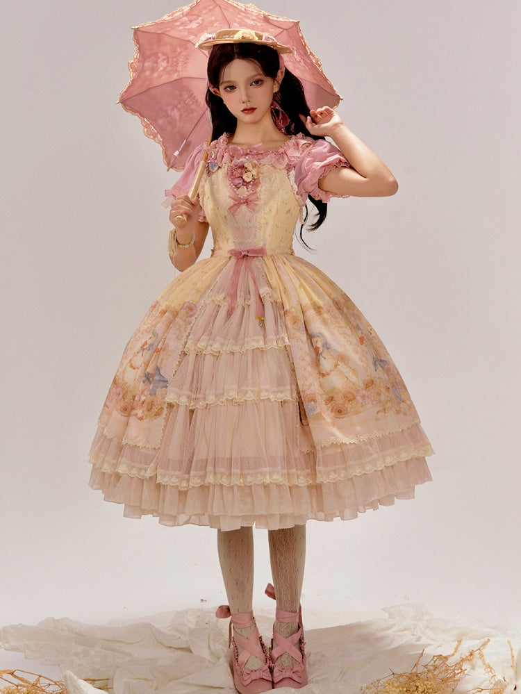 ピンクと白のオールドスクールロリータファッションドレス、蝶結びディテール、ロリータJSKセット