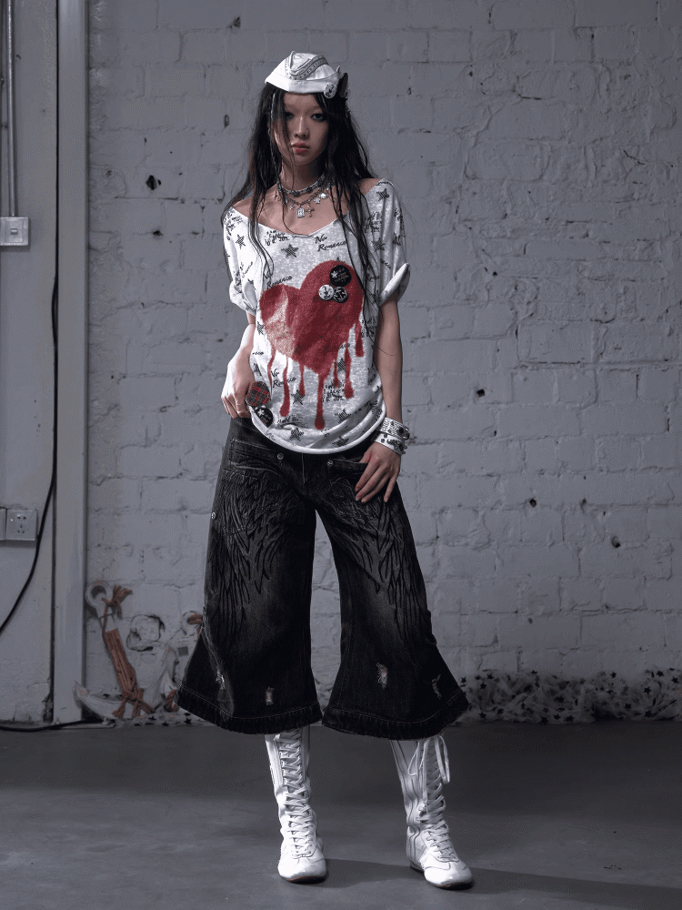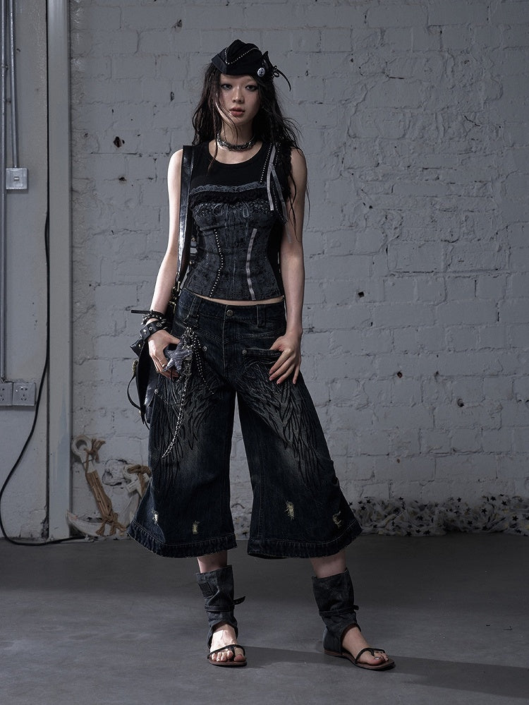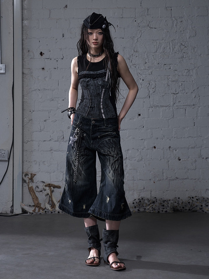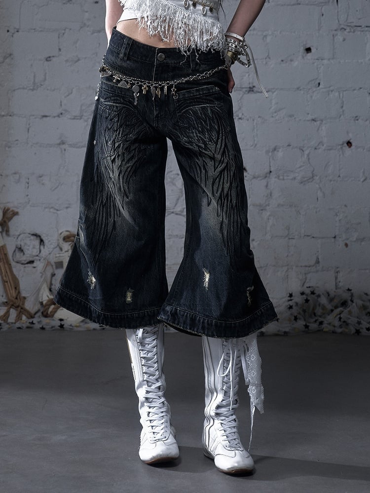 ブルー/イエロー フェードウォッシュ ダメージ加工 穴あき エンジェルウィング 刺繍 ヴィンテージ パンク ワイドレッグ ジーンズ