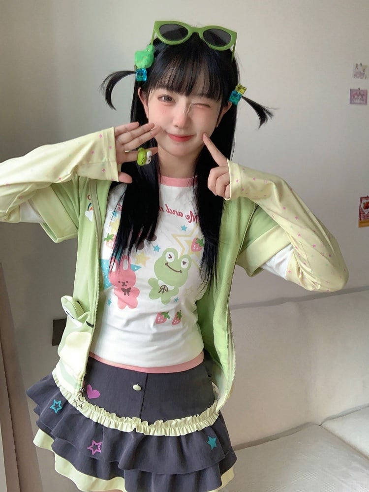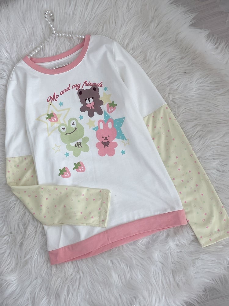 かわいい動物プリントの白いトップス、黄色の星の袖