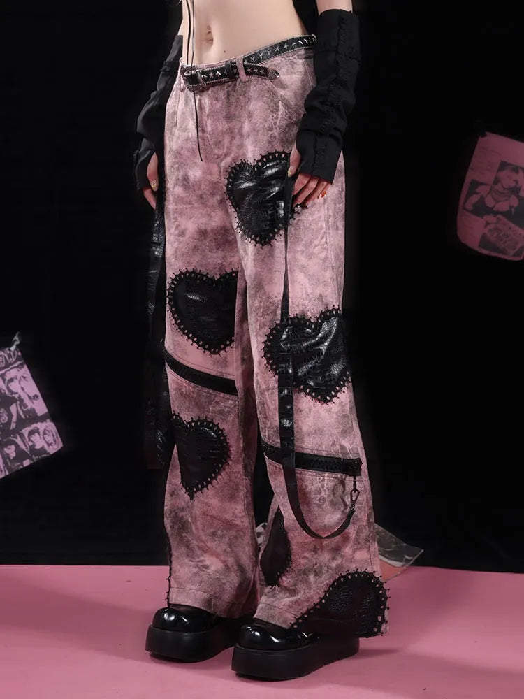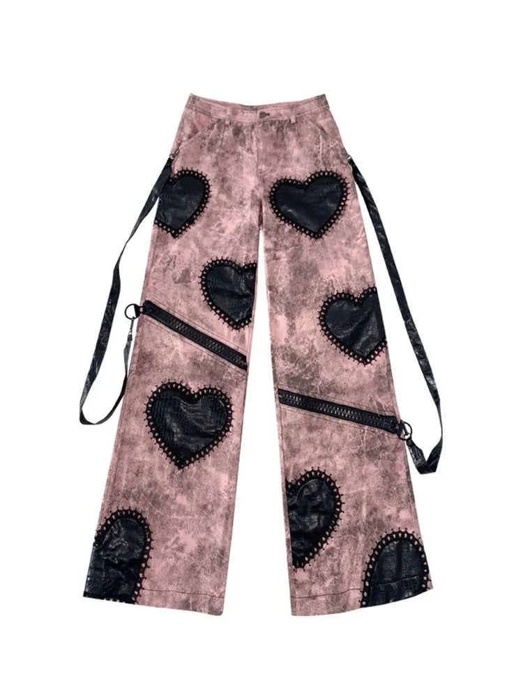 ブラックハートアップリケ ピンク ゴシックパンク ワイドレッグ ジーンズ ジップ付き