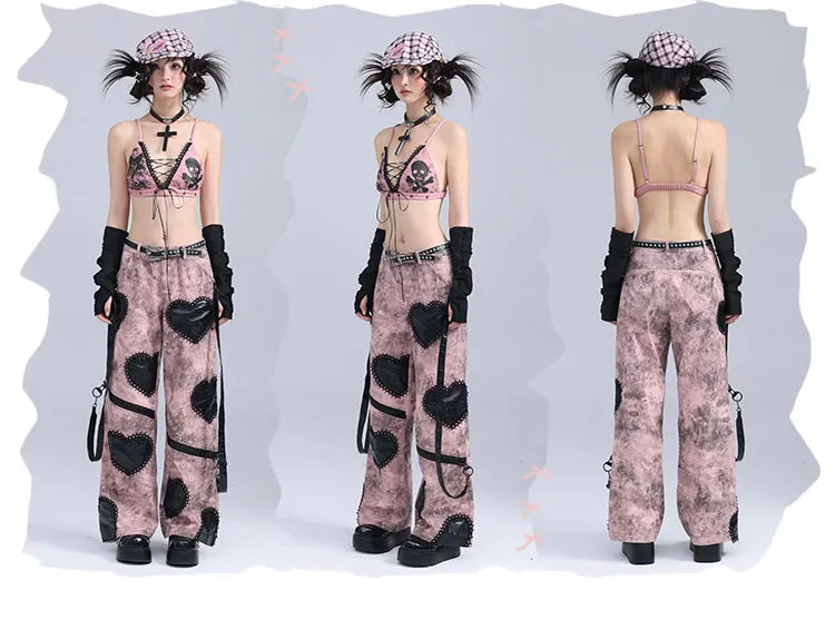 アップリケハートゴシックレッグピンクワイドジーンズブラックジップパンク