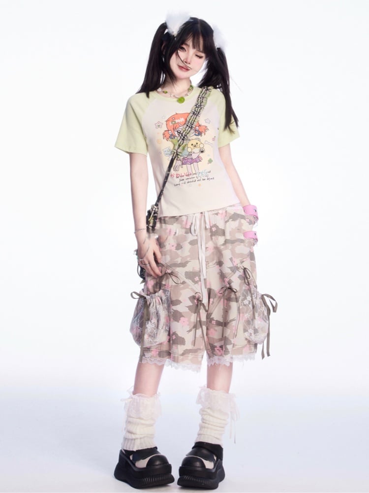 アプリコットとカラーブロックデザインのY2K漫画プリントTシャツ(グリーン)