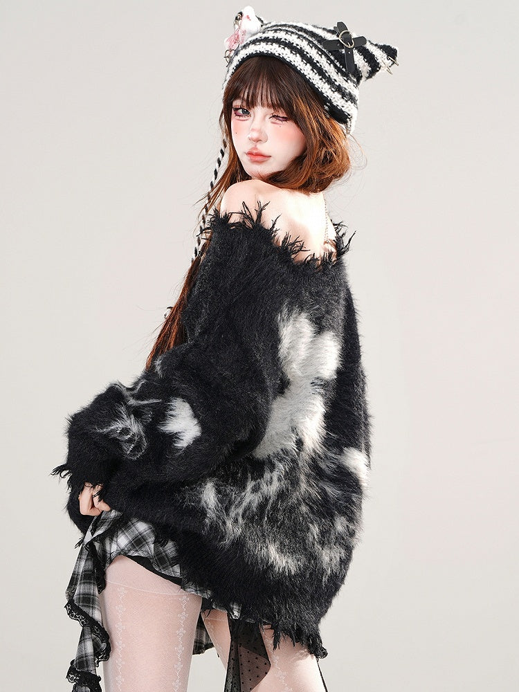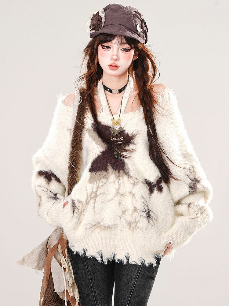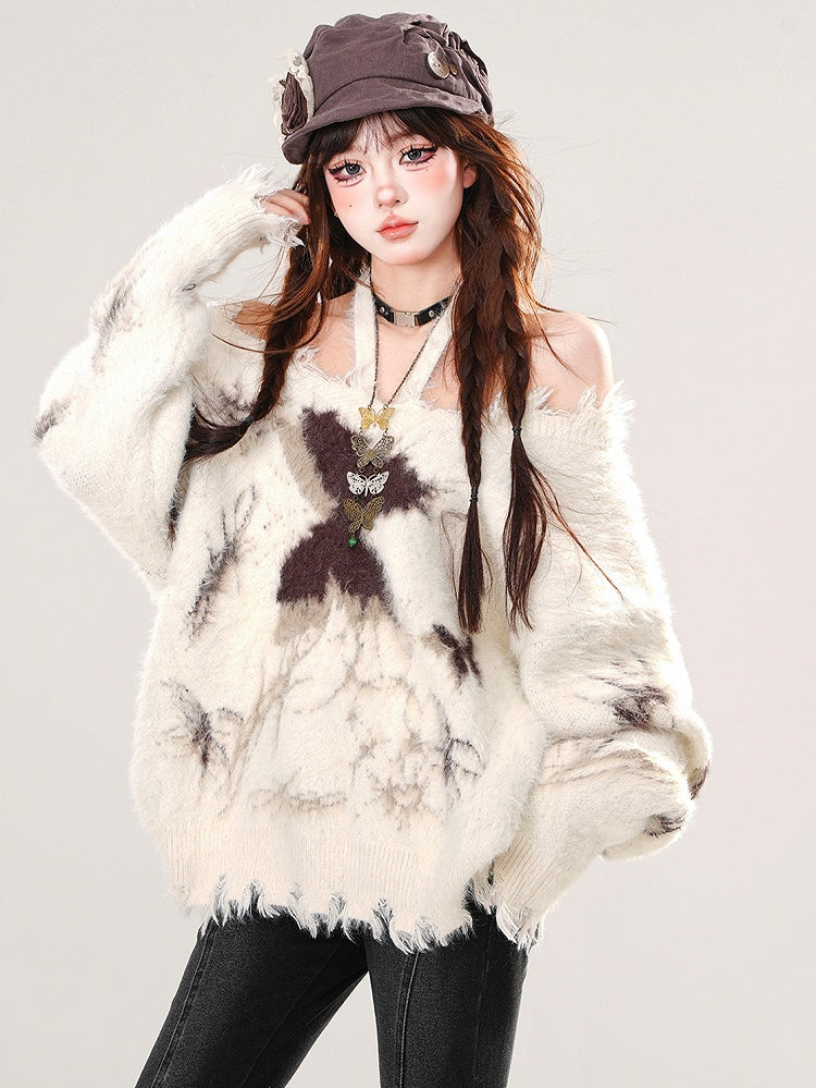アプリコット/ブラック バタフライ ホルターネック モヘア ルーズセーター