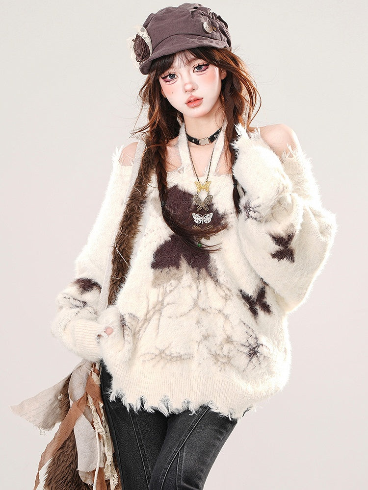 アプリコット/ブラックの蝶々がキュートなホルターネックモヘアルーズセーターは、ワードローブに遊び心をプラスするのにぴったりです。柔らかなモヘア素材で心地よく快適な着心地を実現。ホルターネックのデザインと精巧な蝶のディテールが特徴です。このユニークなセーターで、暖かくスタイリッシュに過ごしましょう。