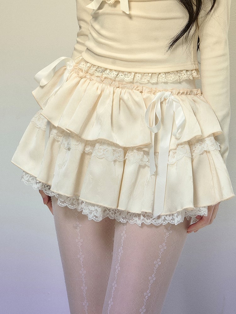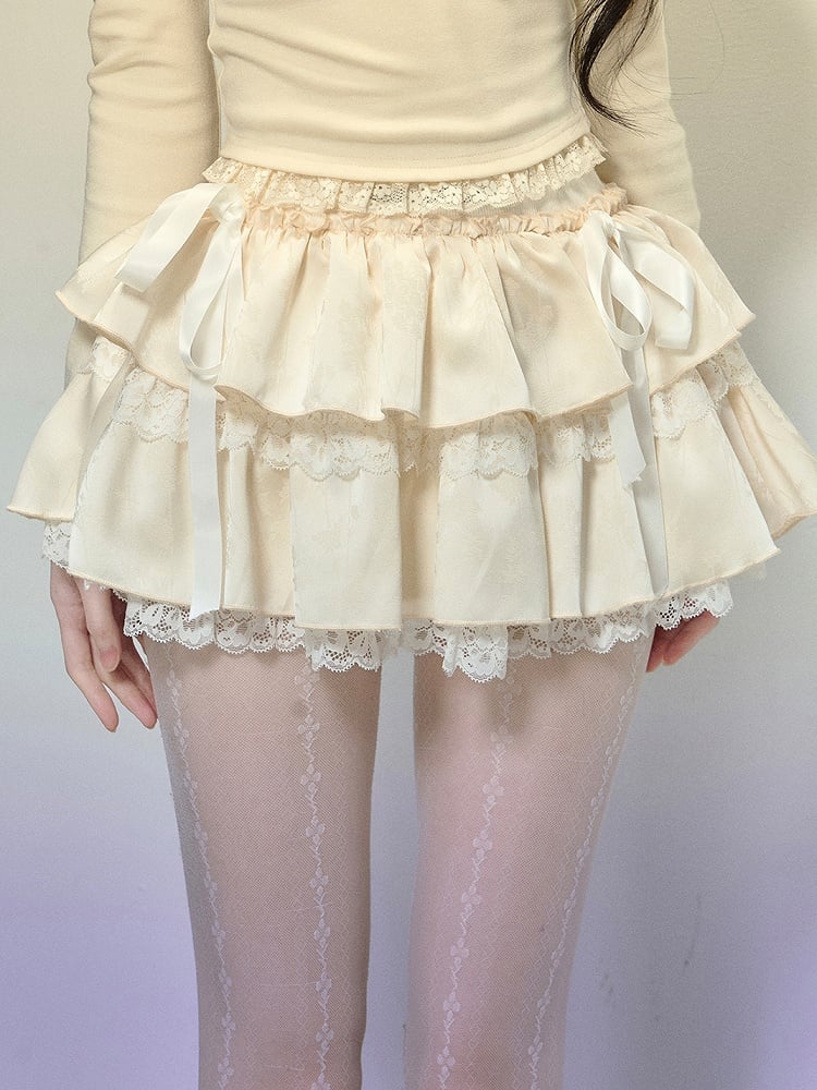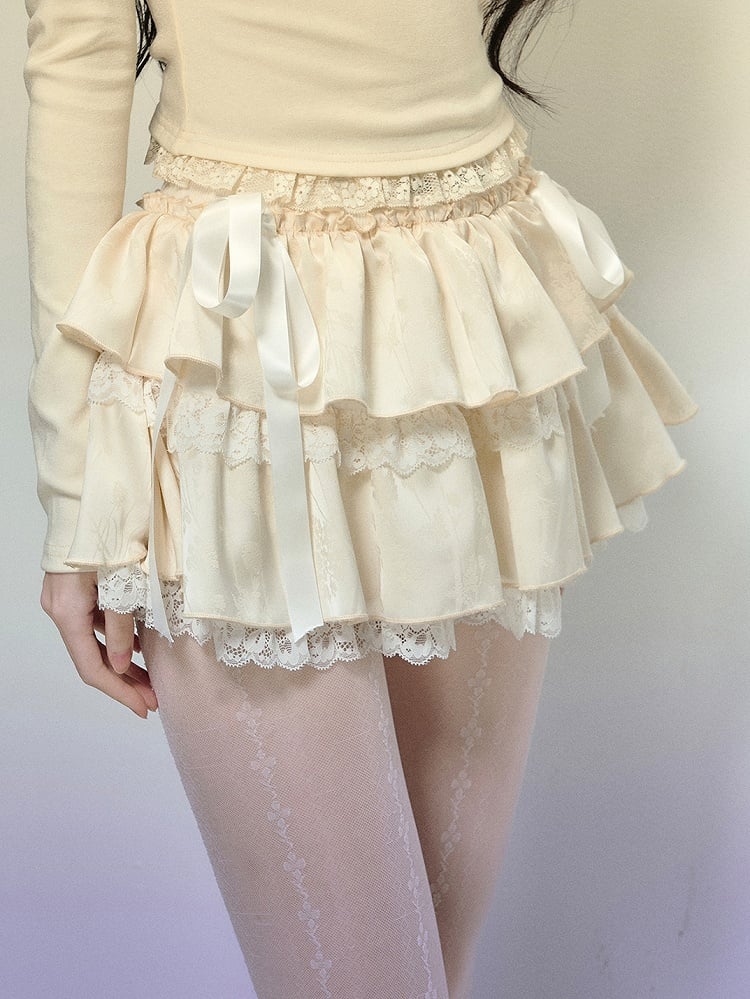 アプリコットリボンアクセントレーストリムティアードミニスカート