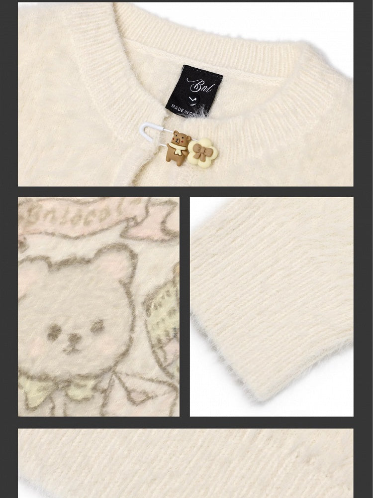 アプリコットのかわいいクマ柄モヘアのルーズセーター。フロントにカットアウトのディテール。