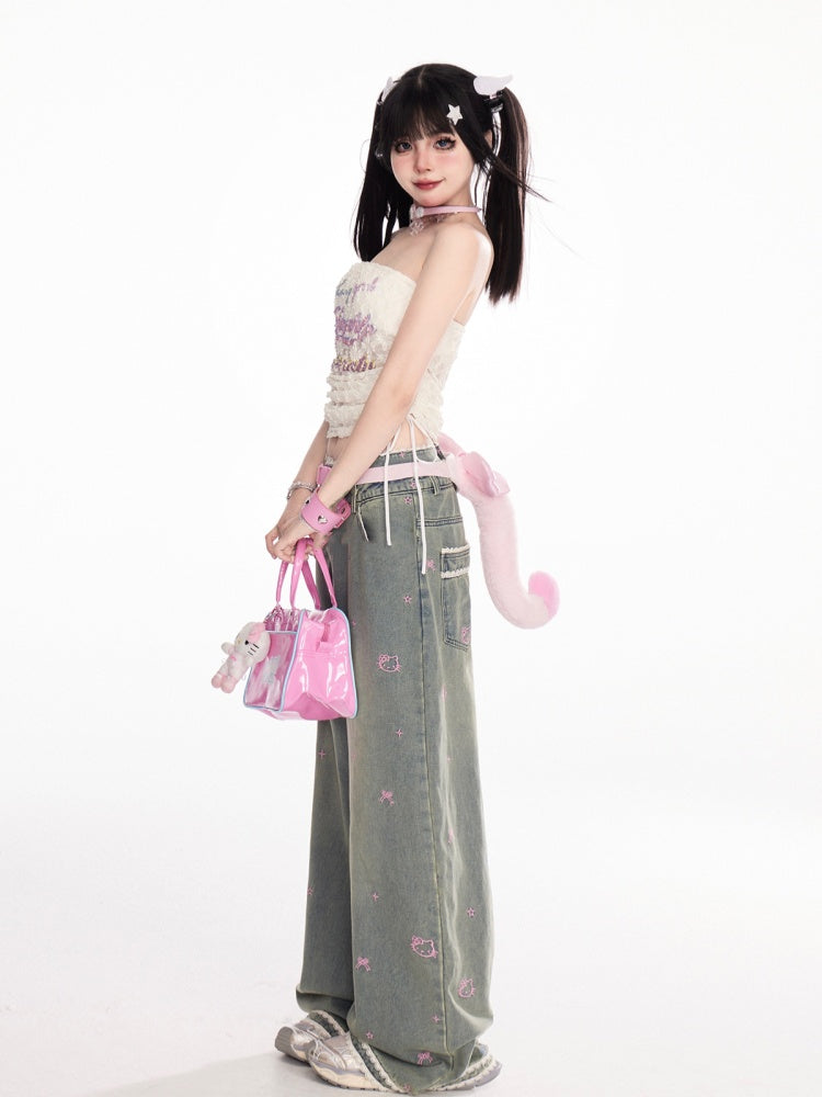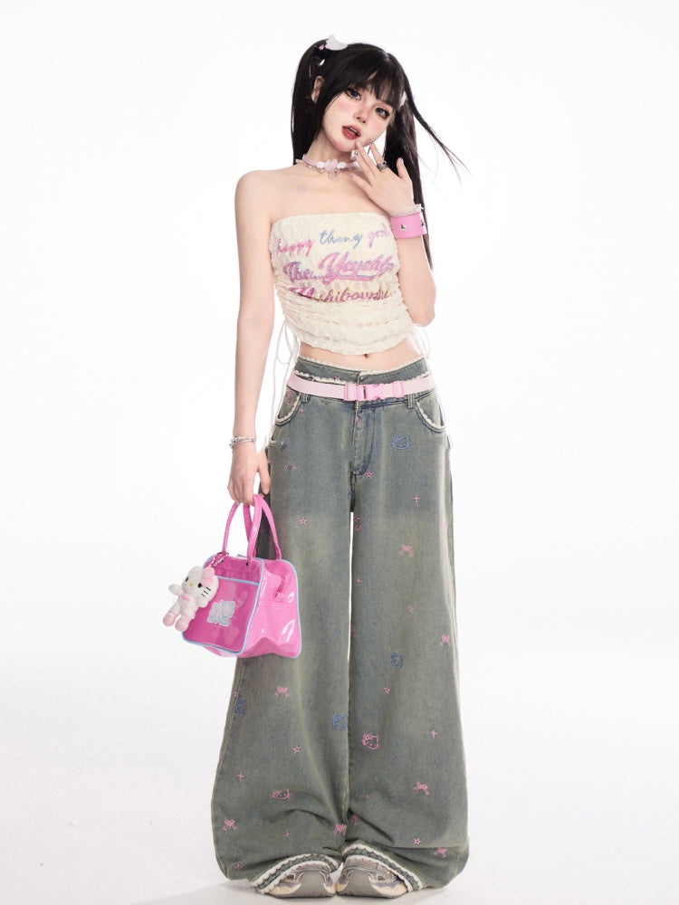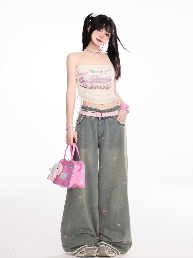 アプリコットドローストリングサイドストラップレストッププリントレースクロップドレター
