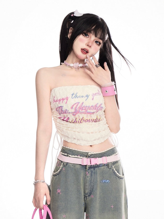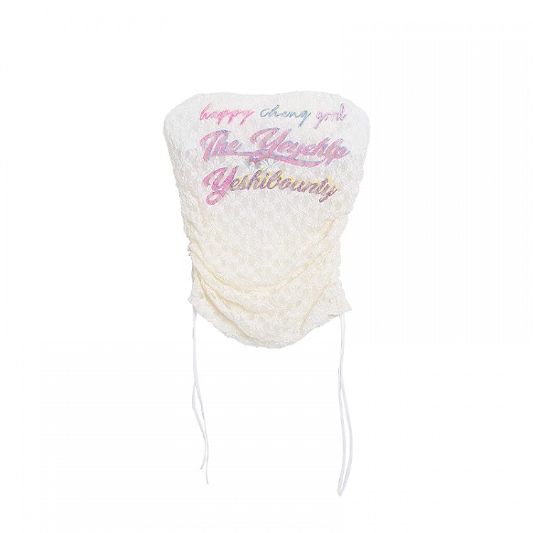 アプリコットドローストリングサイドレタープリントレースクロップドストラップレストップ
