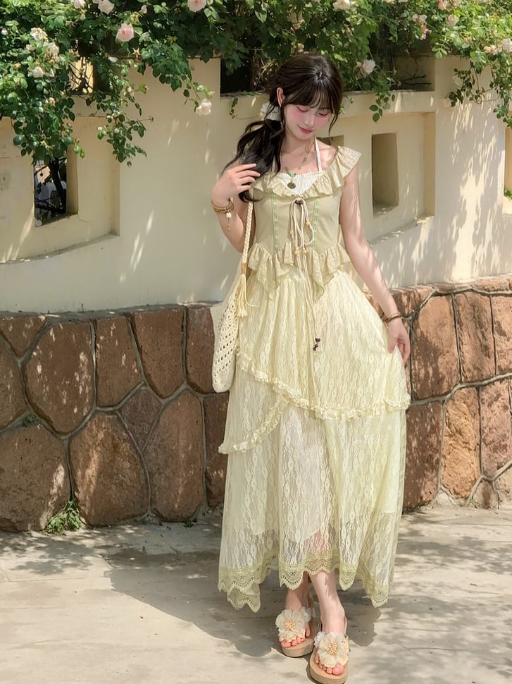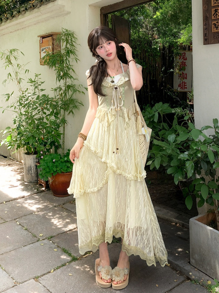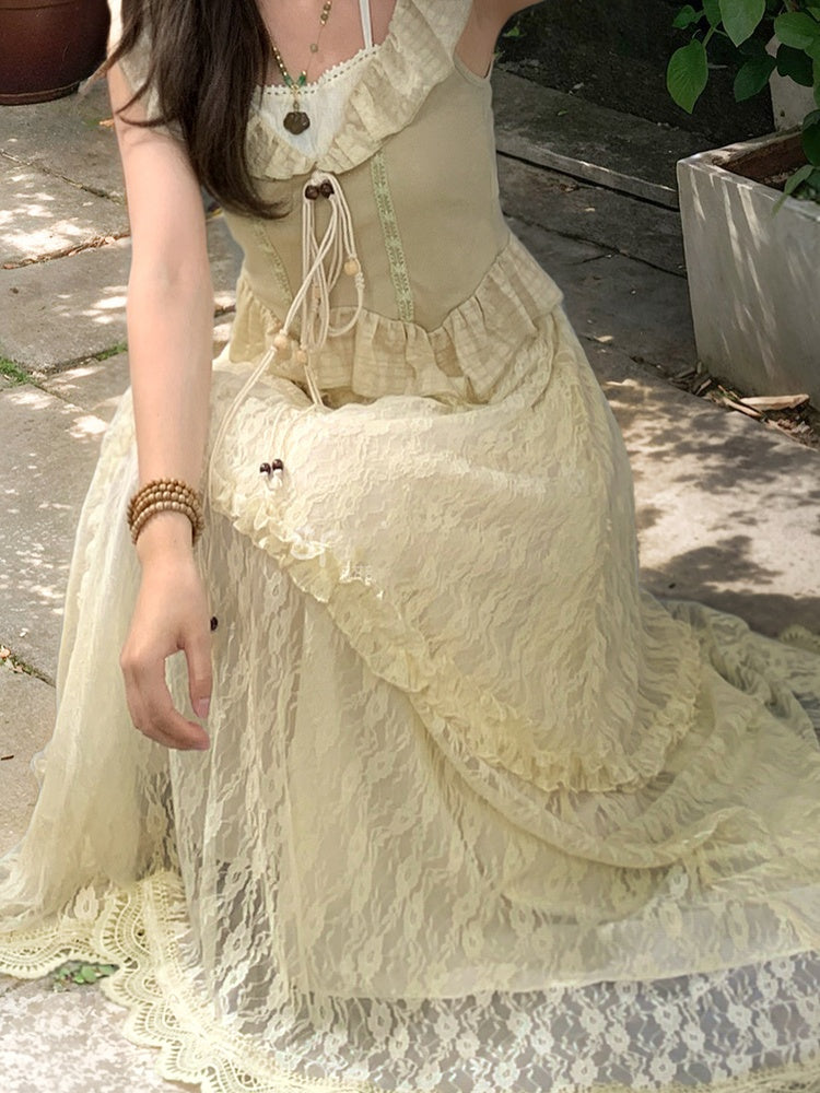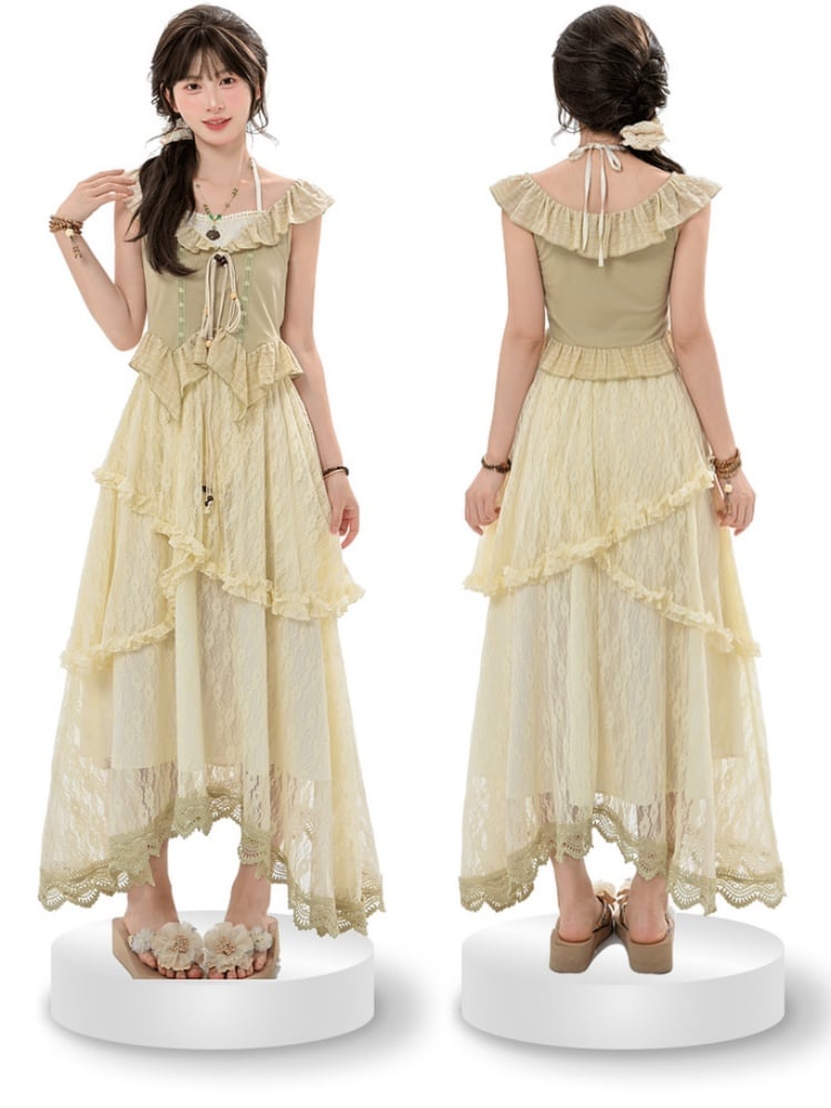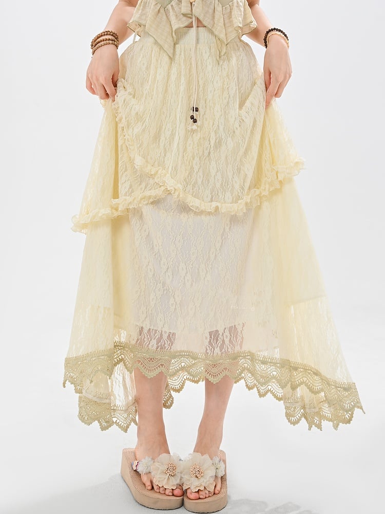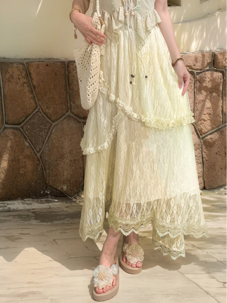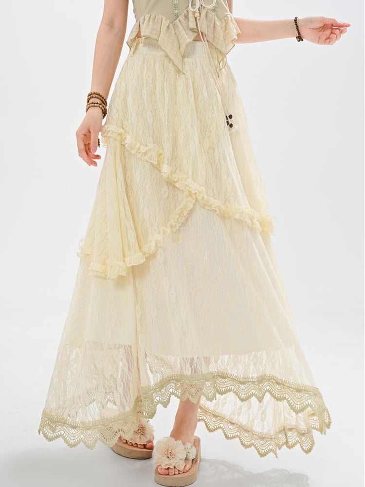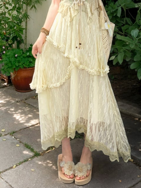 アプリコット ゴムウエスト アシンメトリー レーススカート