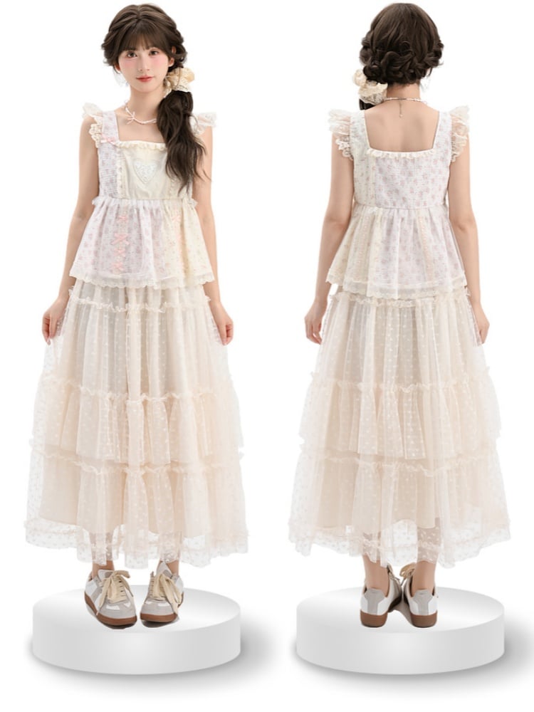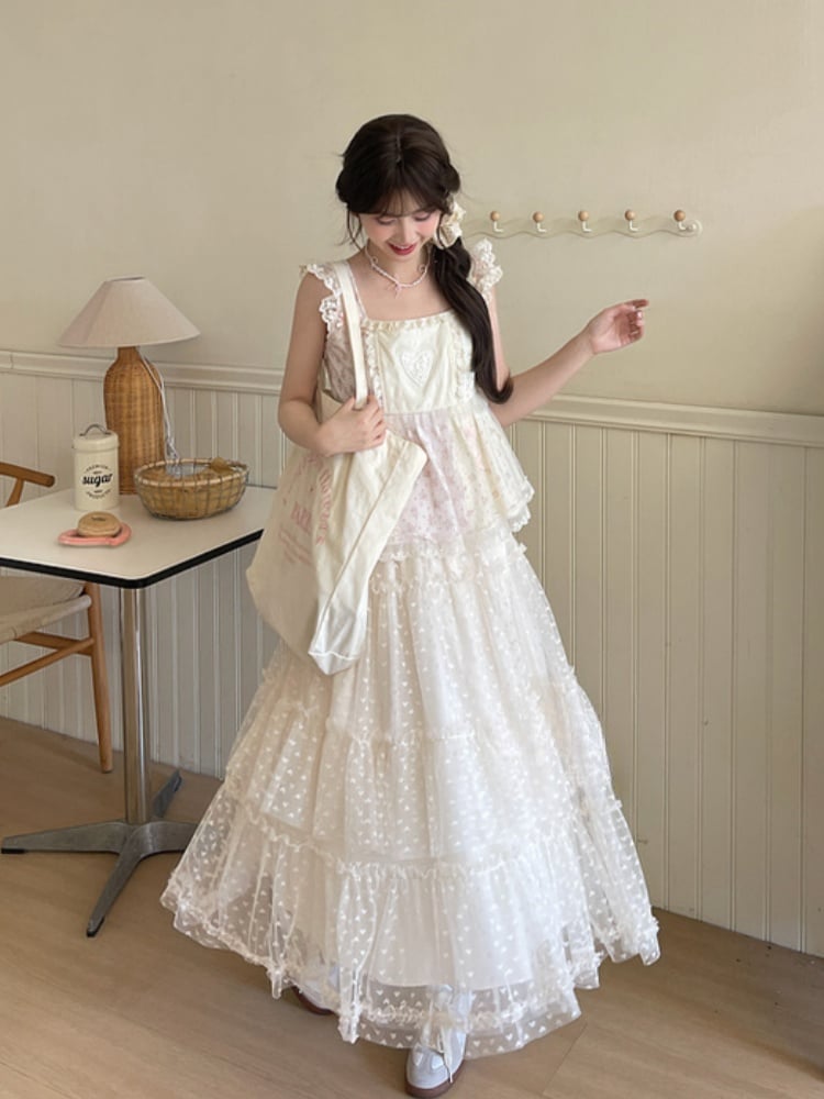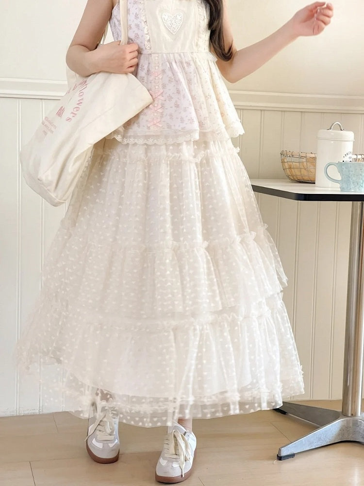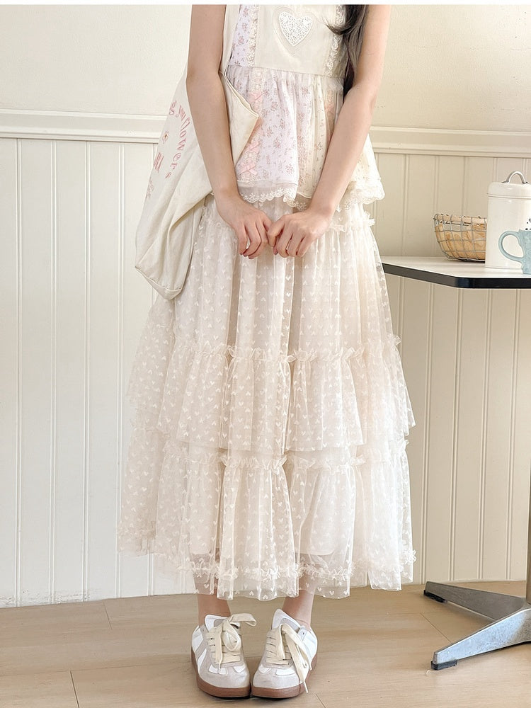 アプリコット ゴムウエスト ハート柄 メッシュ ティアードスカート