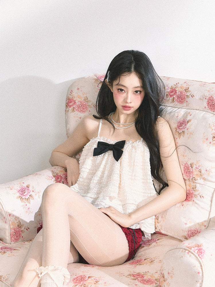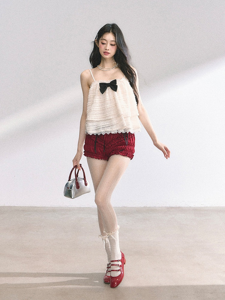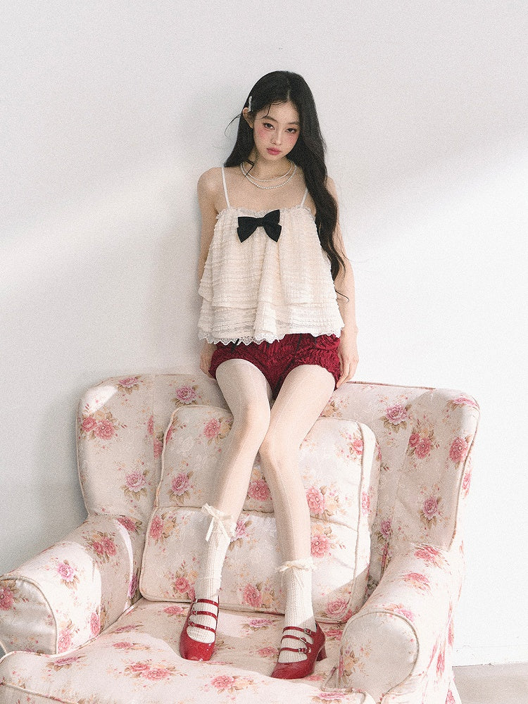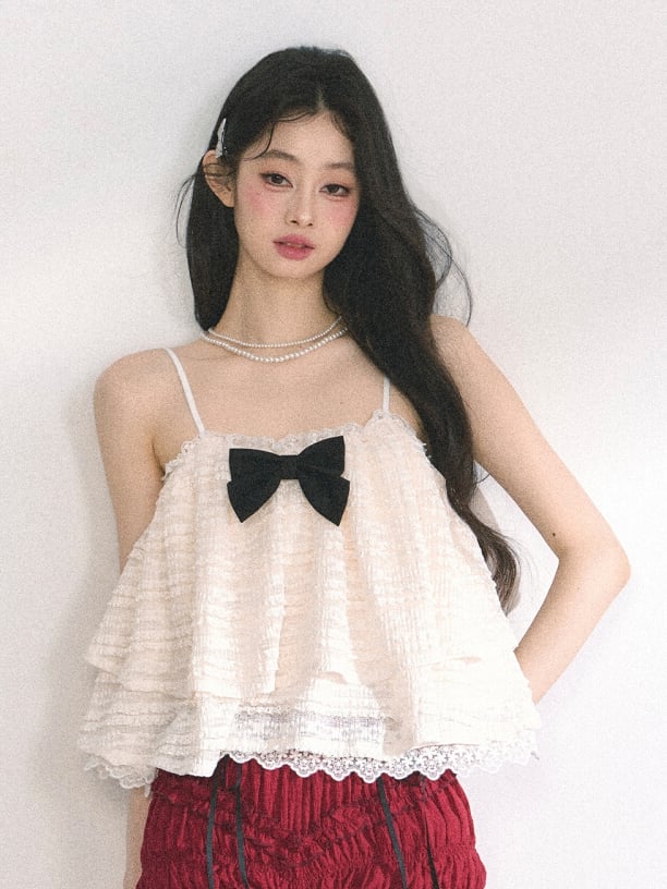 ブラックリボンとアプリコットのレーストリムが特徴のティアードキャミソールトップ
