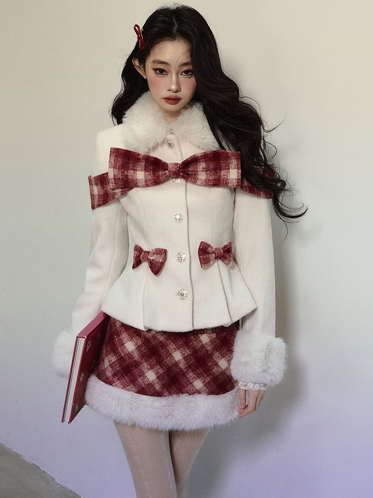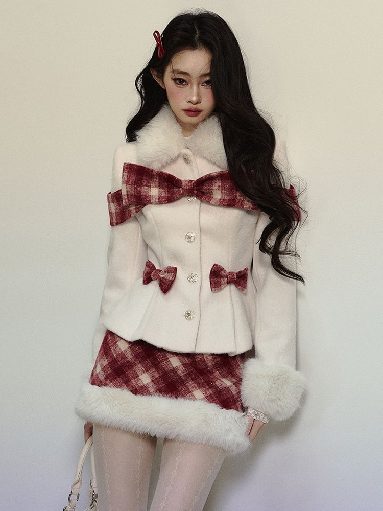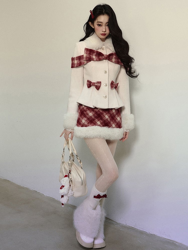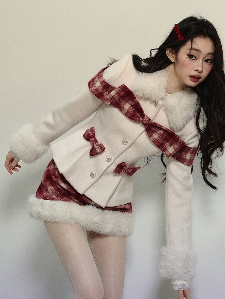 アプリコットチェックのウールジャケットは、キュートなリボンがアクセントになり、素敵な雰囲気を演出します。ワードローブにプラスして、暖かくスタイリッシュに過ごしましょう。