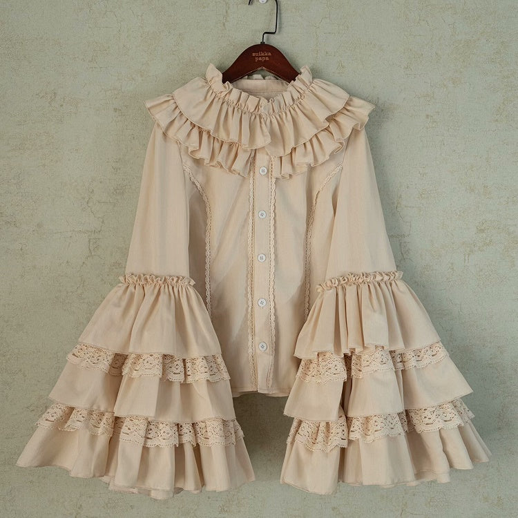アプリコットのフリルネックライン、レイヤードベルスリーブブラウス