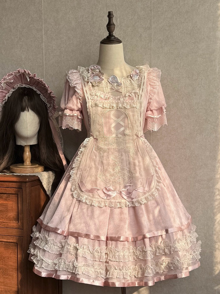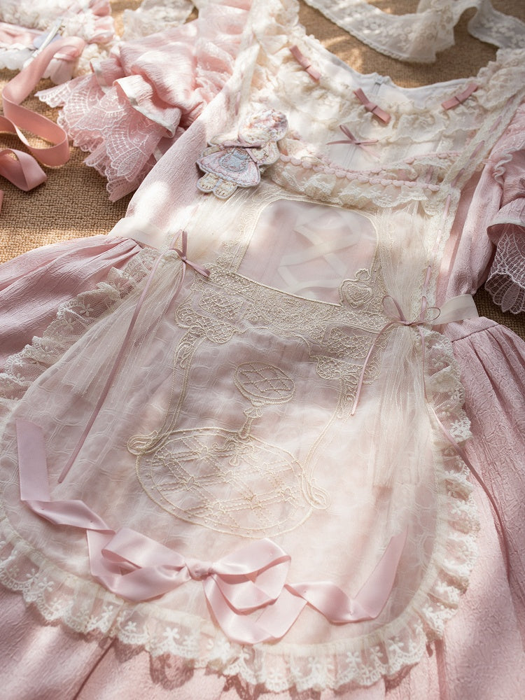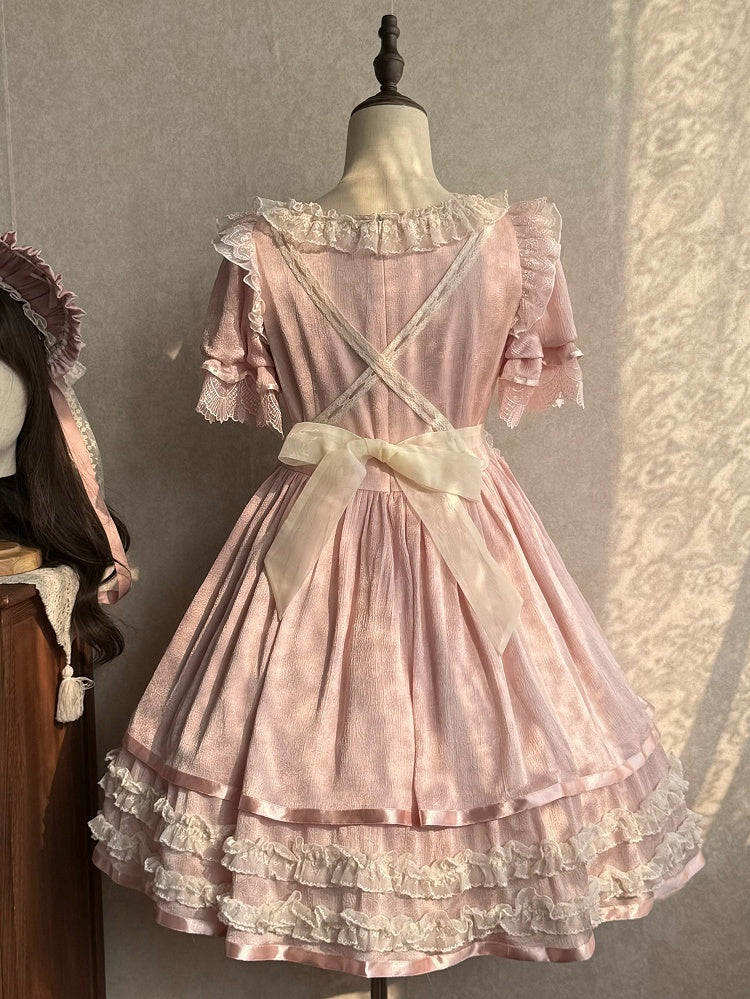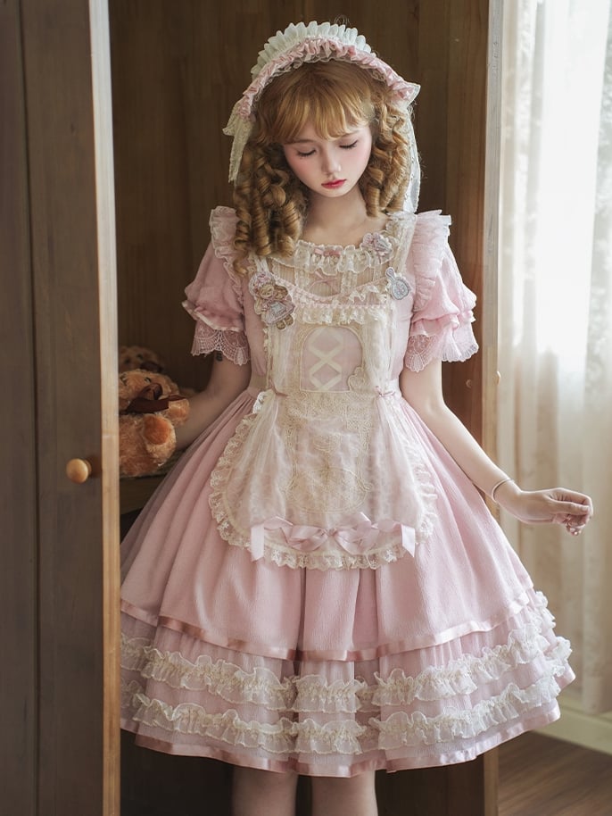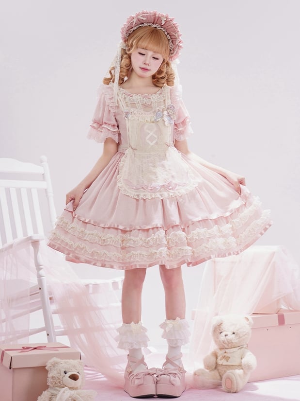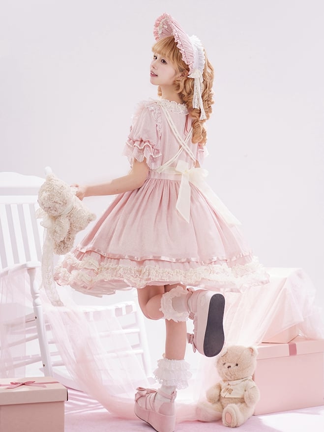 ピンクと白のオールドスクールロリータファッションドレス、蝶結びディテール、ロリータJSKセット