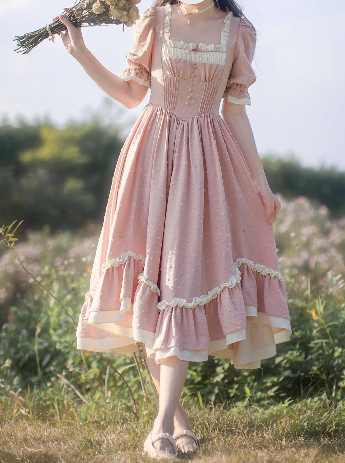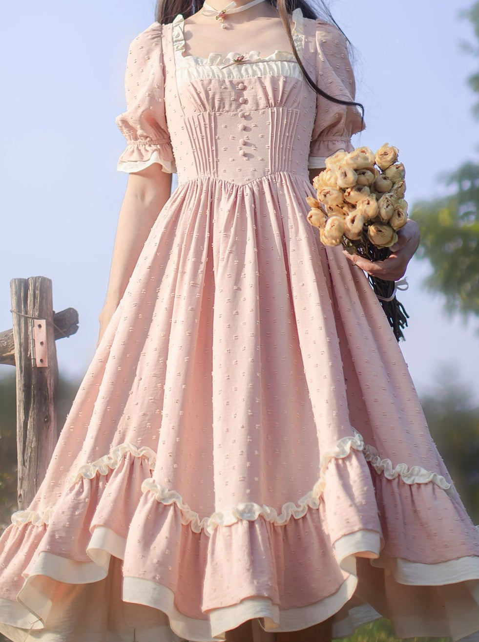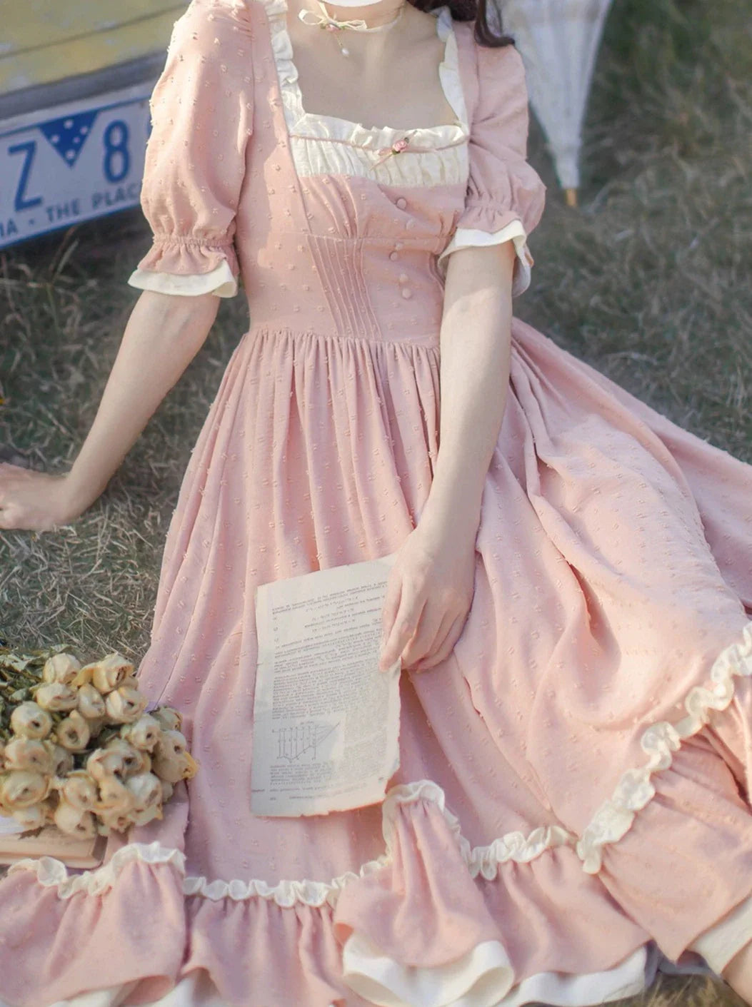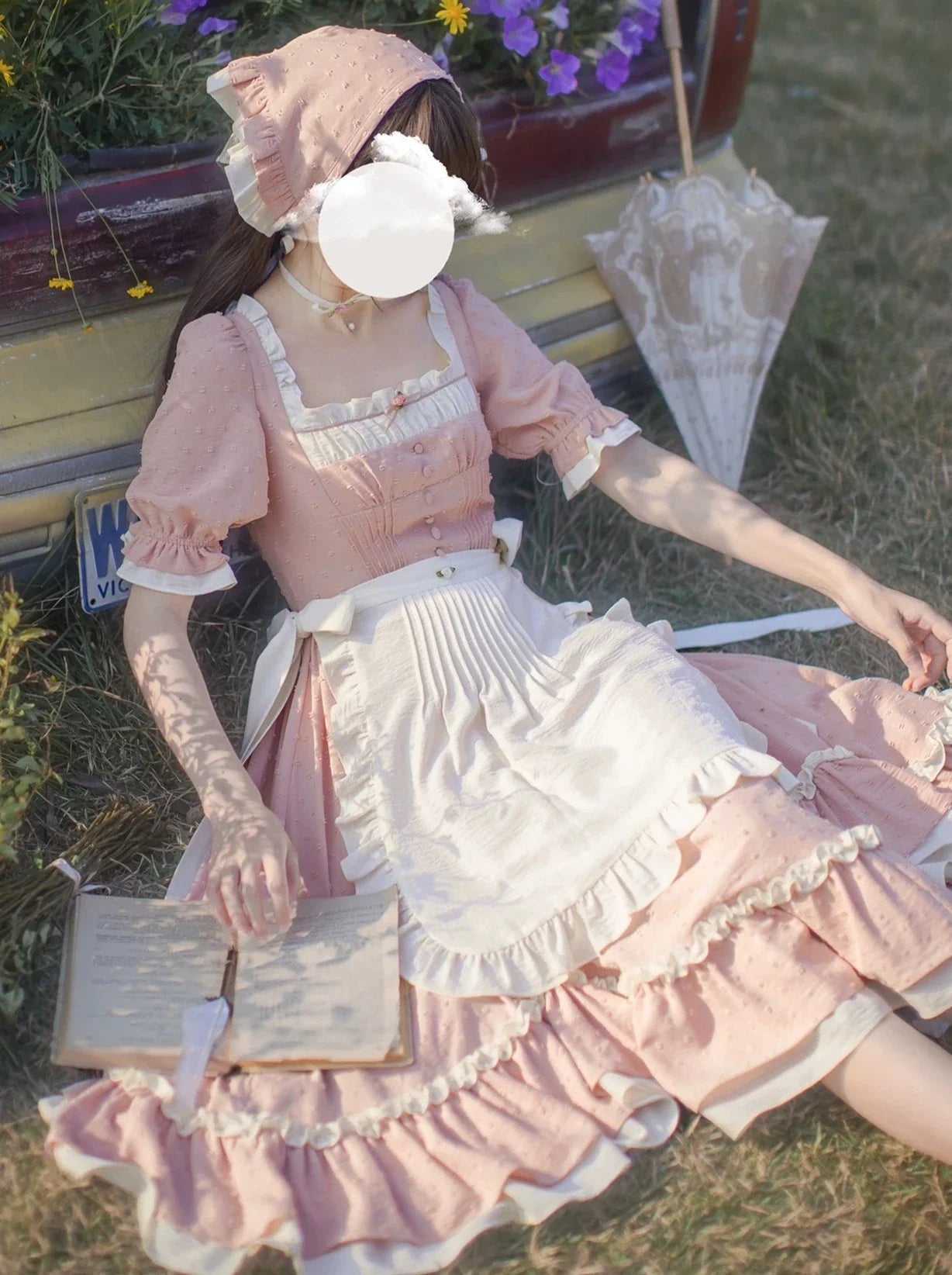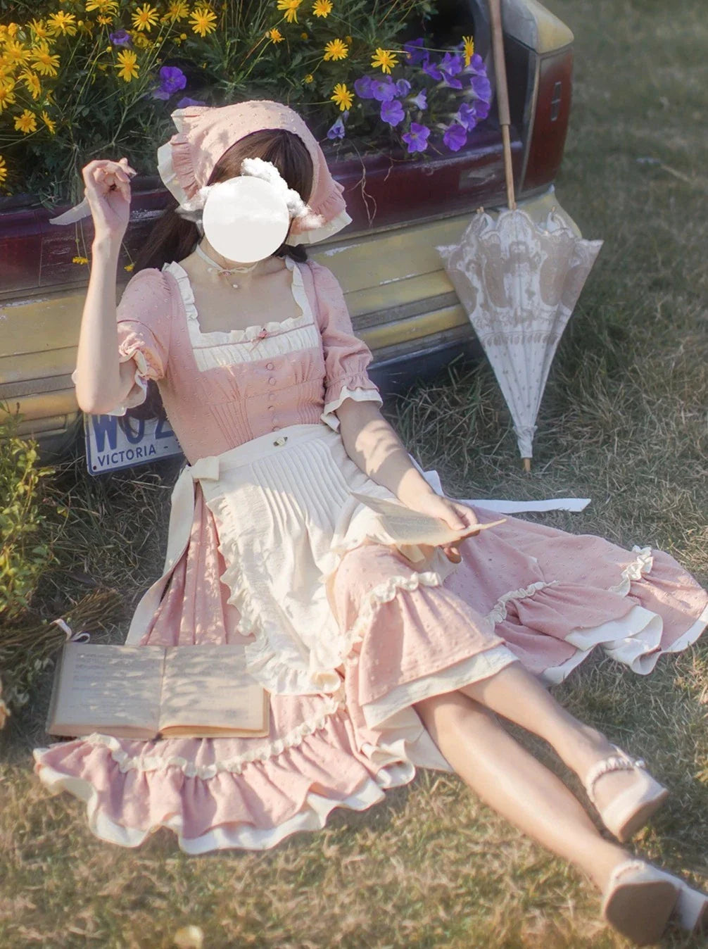 ピンクと白のオールドスクールロリータファッションドレス、蝶結びディテール、ロリータJSKセット