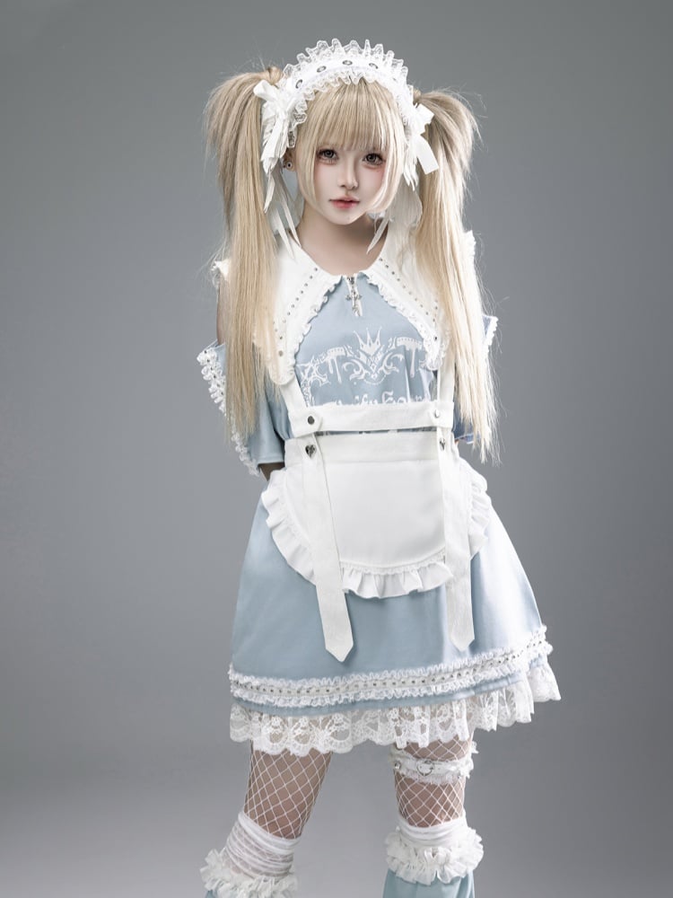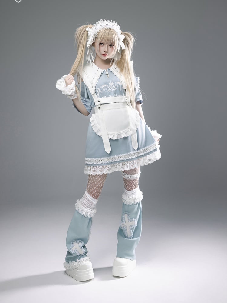 青と白のオールドスクールロリータファッションドレス 蝶結びディテール JSK セット