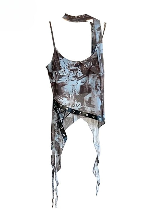 ブルーのビタースイートなレースアップディテール、アシンメトリーヘムのキャミソールトップス+スカーフ