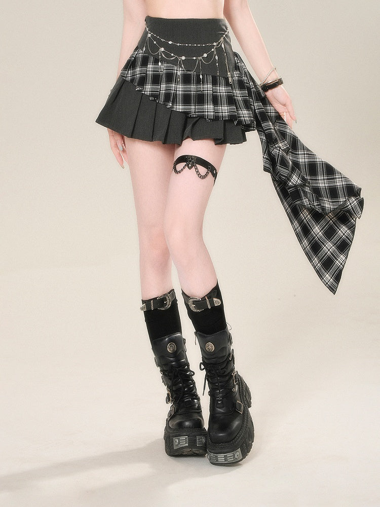 ダークグレーのチェック柄パッチワークデザイン、アシンメトリーヘムのグラマラスプリーツスカート