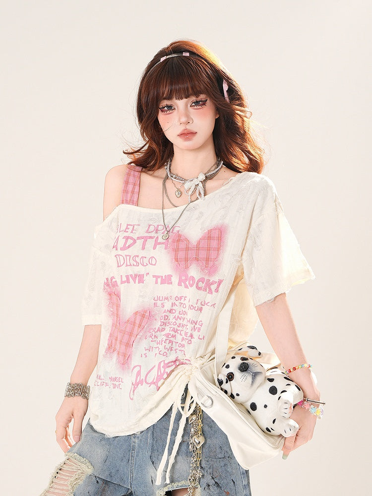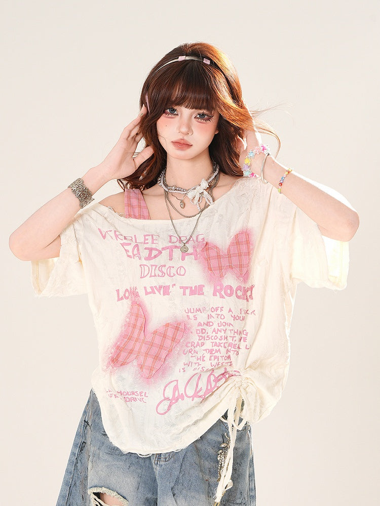 アシンメトリーネックライン、バタフライアップリケ、アプリコットカラー、スイートTシャツ、ダメージ加工、穴あき