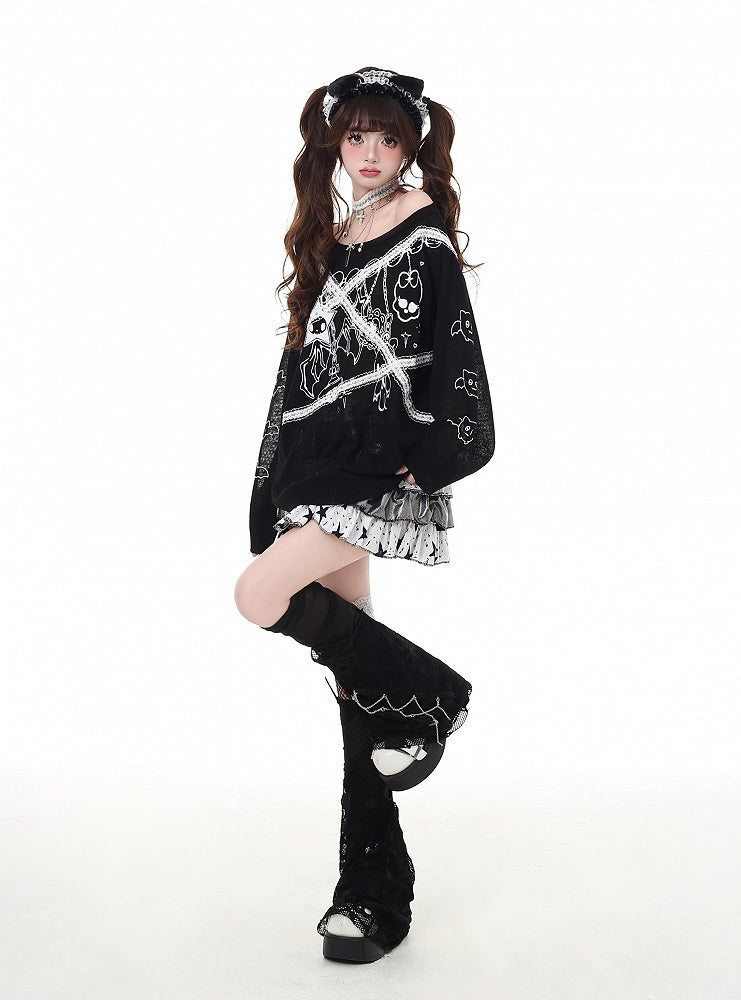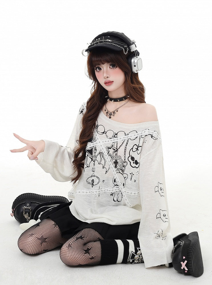 ブラック/ホワイトのアシンメトリーネックライン、レースアップリケ、日焼け防止、グラマラスグラフィックトップス