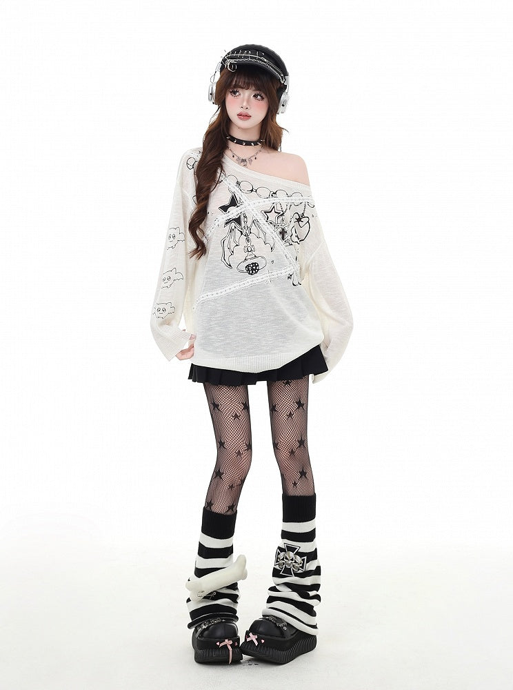 アシンメトリーネックラインのレース、ブラック/ホワイト、日焼け防止、グラマラスなアップリケ、グラフィックトップ
