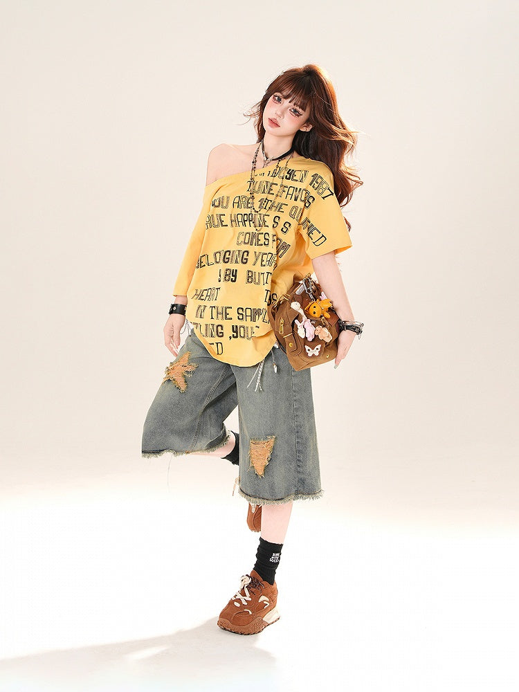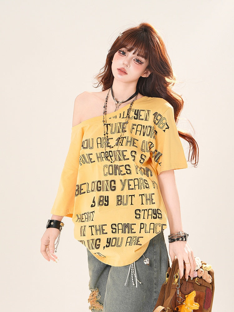 アシンメトリーネックライン レタープリント ルーズTシャツ イエロー/ホワイト/ブラック