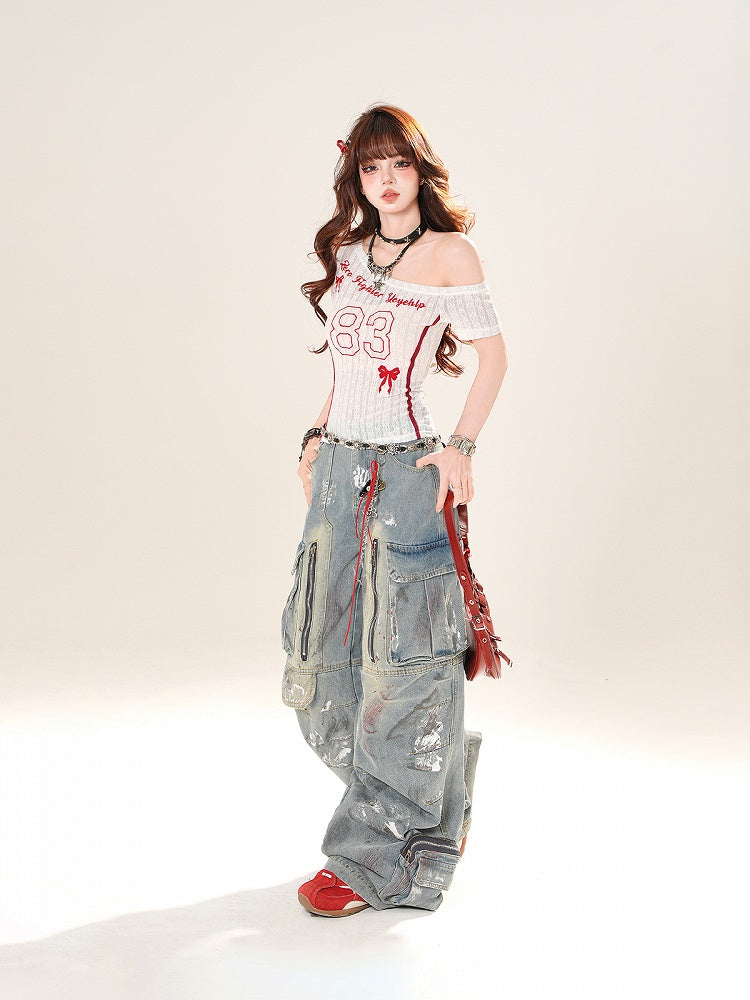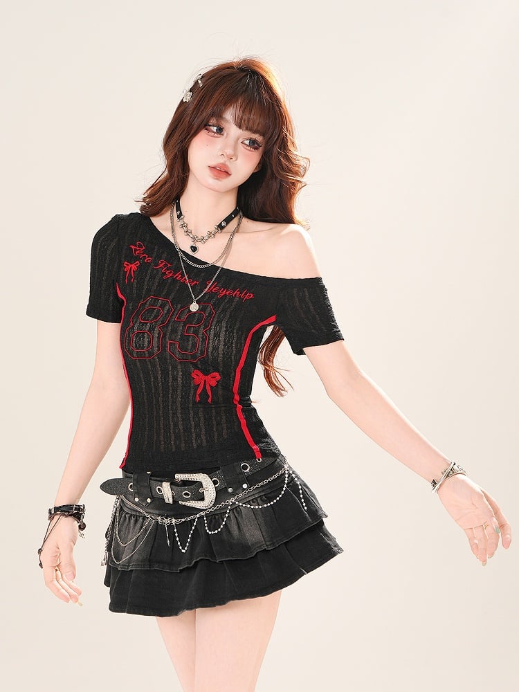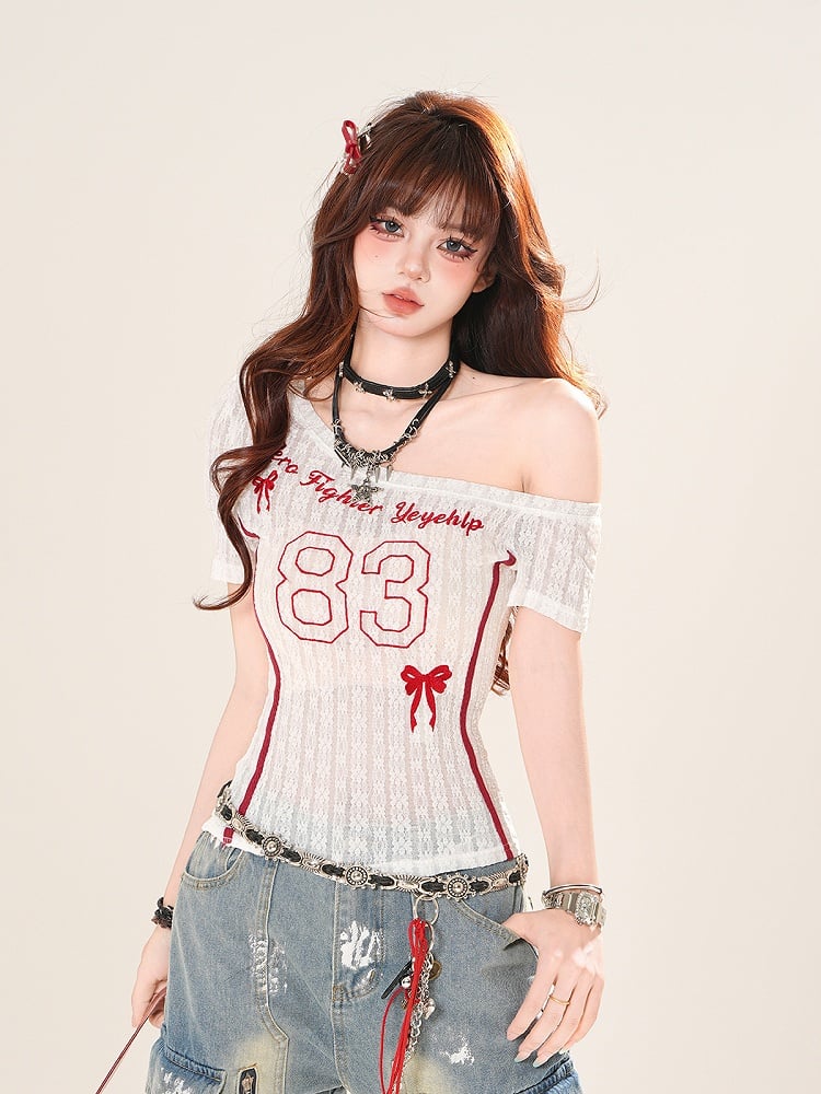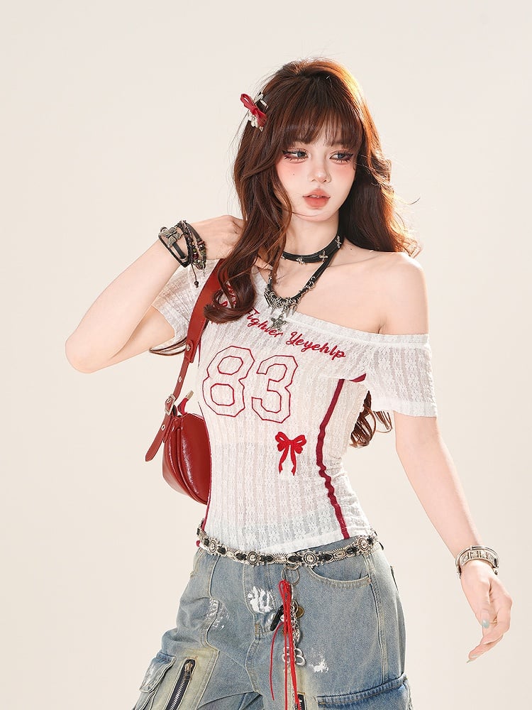 アシンメトリーネックライン ナンバープリント ホワイト/ブラック セミシアーTシャツ