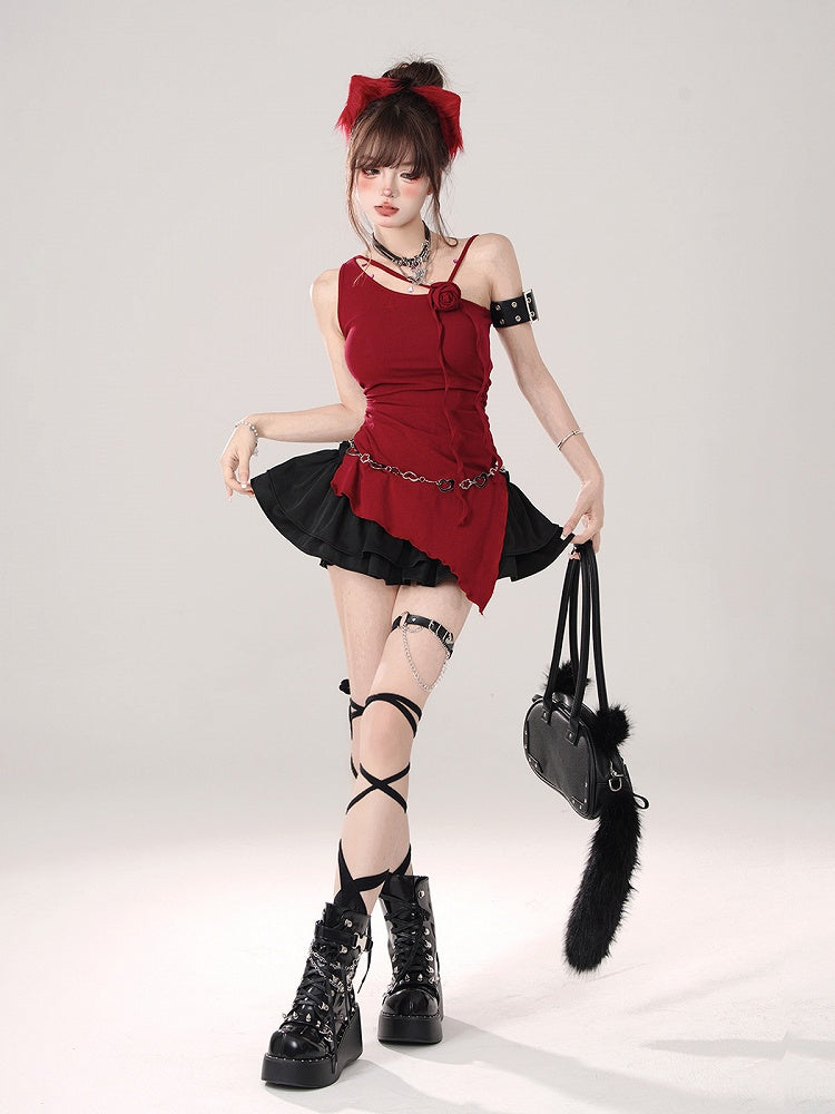 Red Asymmetrical Shoulder Sleeveless Top with Rose Accent