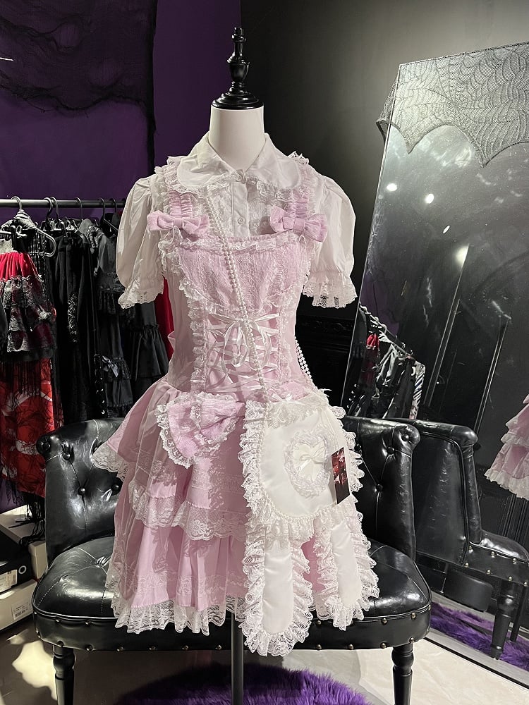 ピンクと白のオールドスクールロリータファッションドレス、蝶結びディテール、ロリータJSKセット
