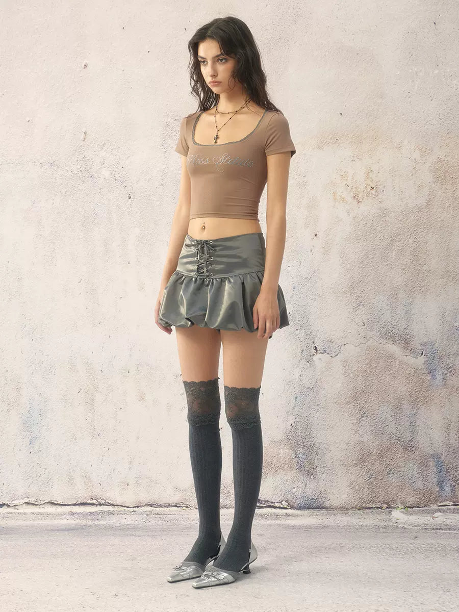バルーンスカートで、ファッションステートメントを演出しましょう!光沢のあるダークカラーの生地を使用し、キュートなレースアップデザインがポイント。このスカートで遊び心をアピールすれば、きっと注目を集めること間違いなしです。