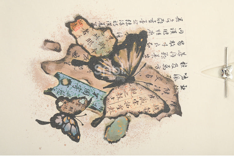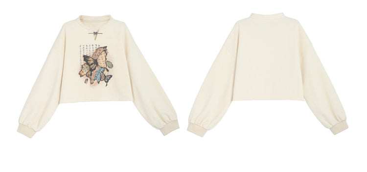 チャイナドレス風 バタフライプリント ブラック/アプリコット バンドカラー スウェットシャツ
