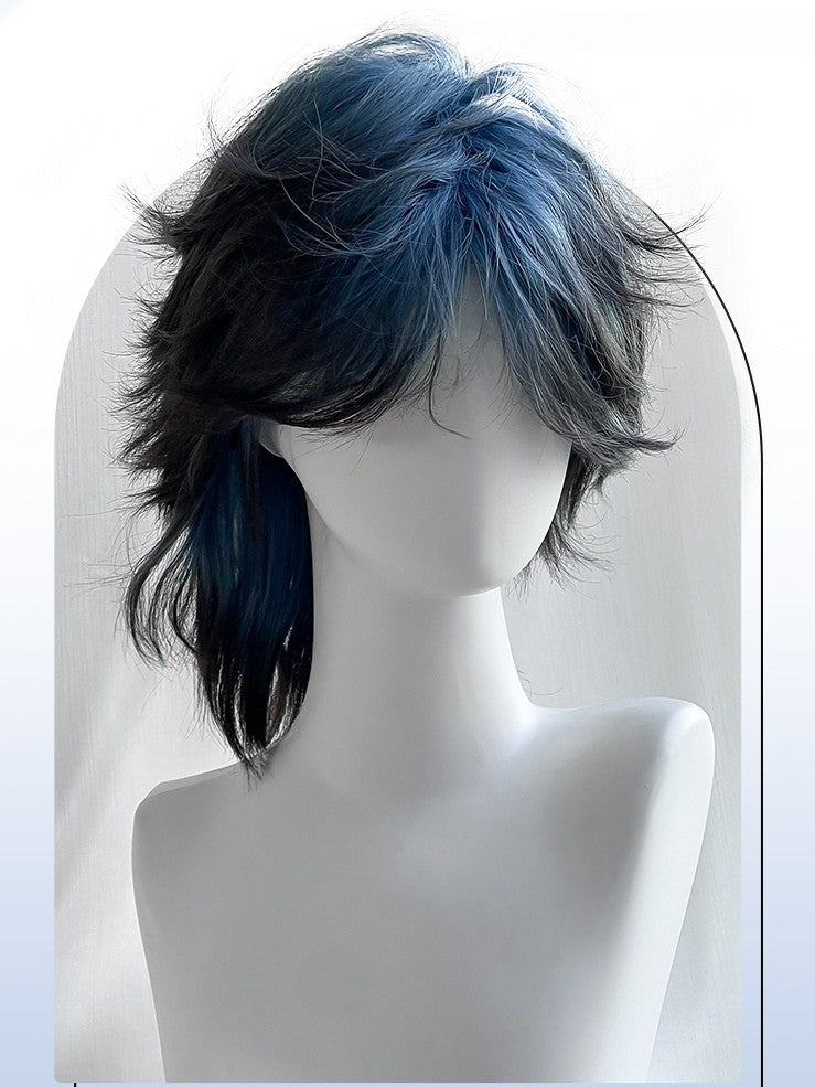 黒と青のハイライト王子スタイル 38cm 長さストレートウィッグ(前髪あり)