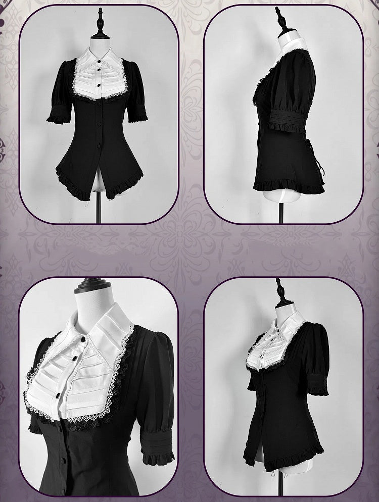 白いコウモリの羽根の形の襟、黒のゴシックな半袖シャツ