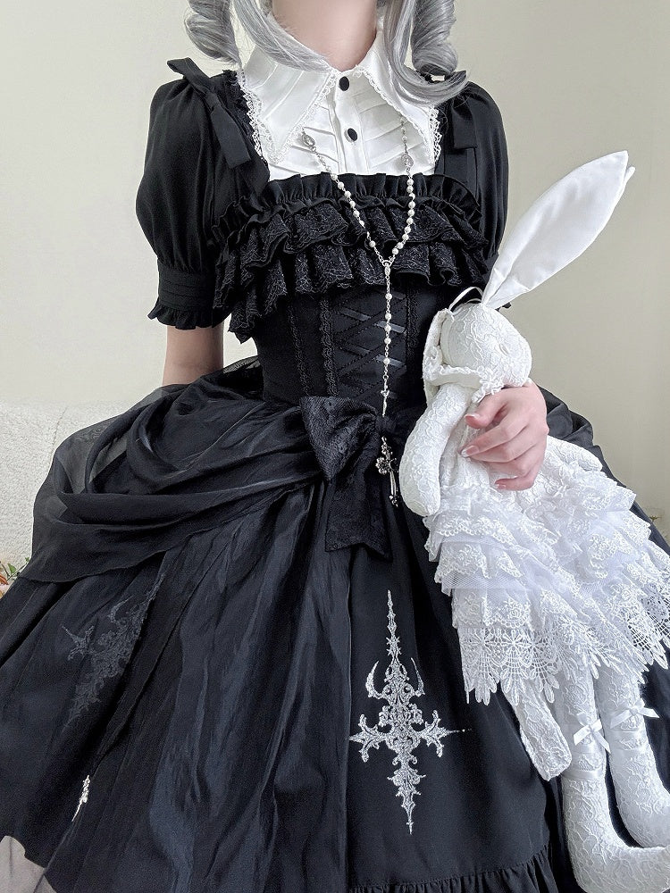 黒と白のオールドスクールロリータファッションドレス蝶結びロリータJSKセット