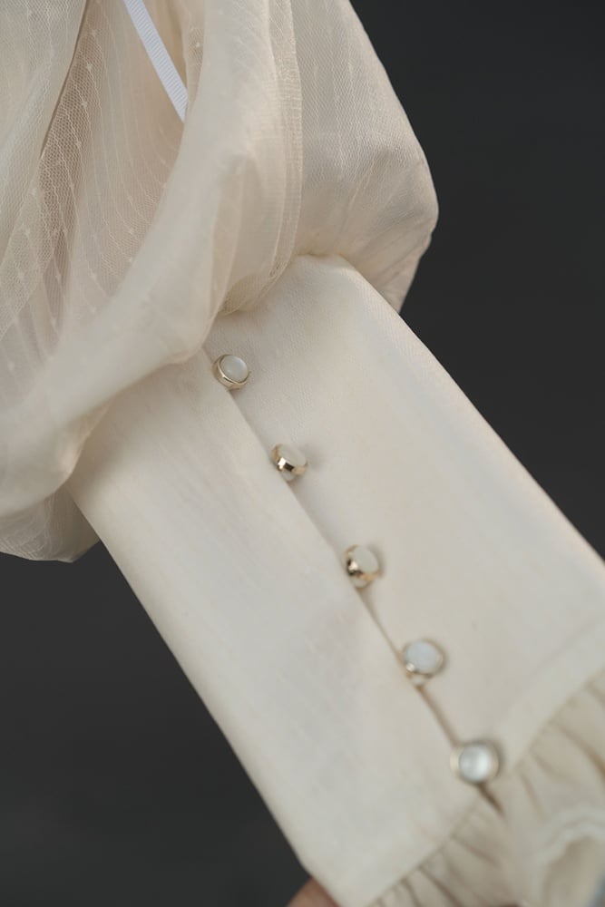 ベージュとブルーのフリルクロスオーバーネックライン長袖シャツ