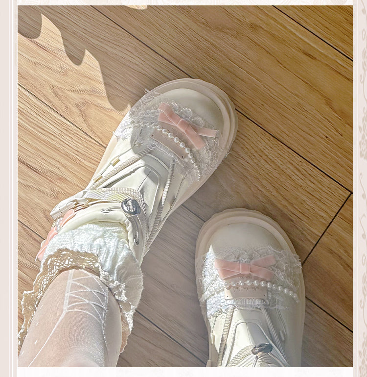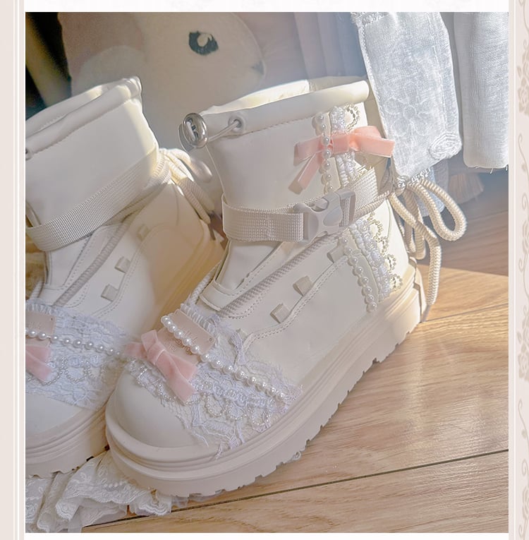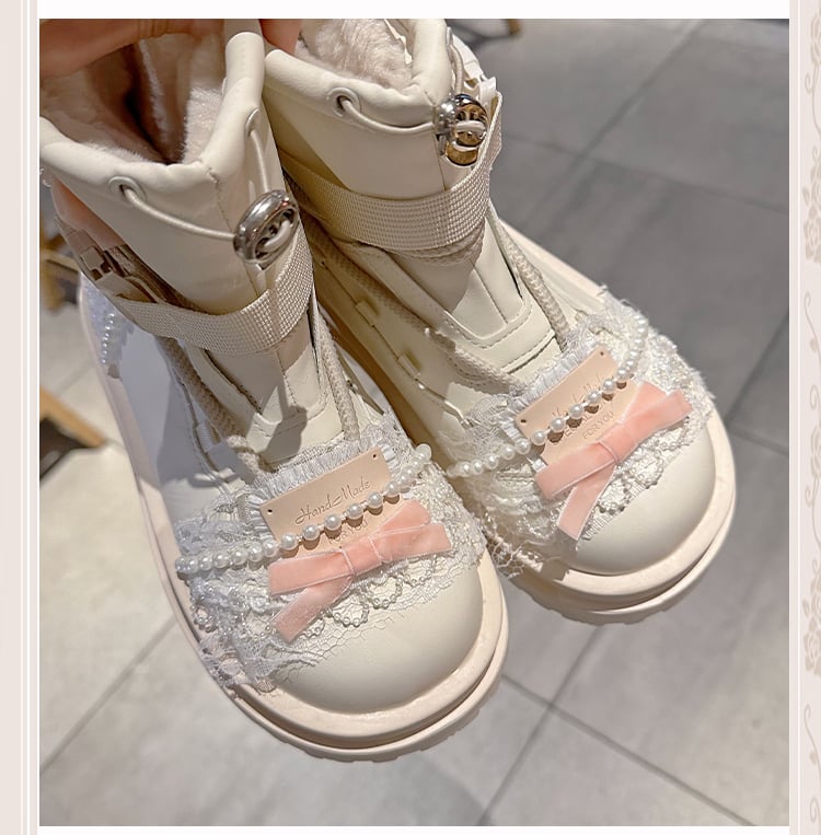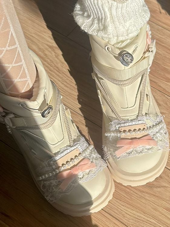 ベージュのリボンとレースのビーズチェーンのアンクルブーツ